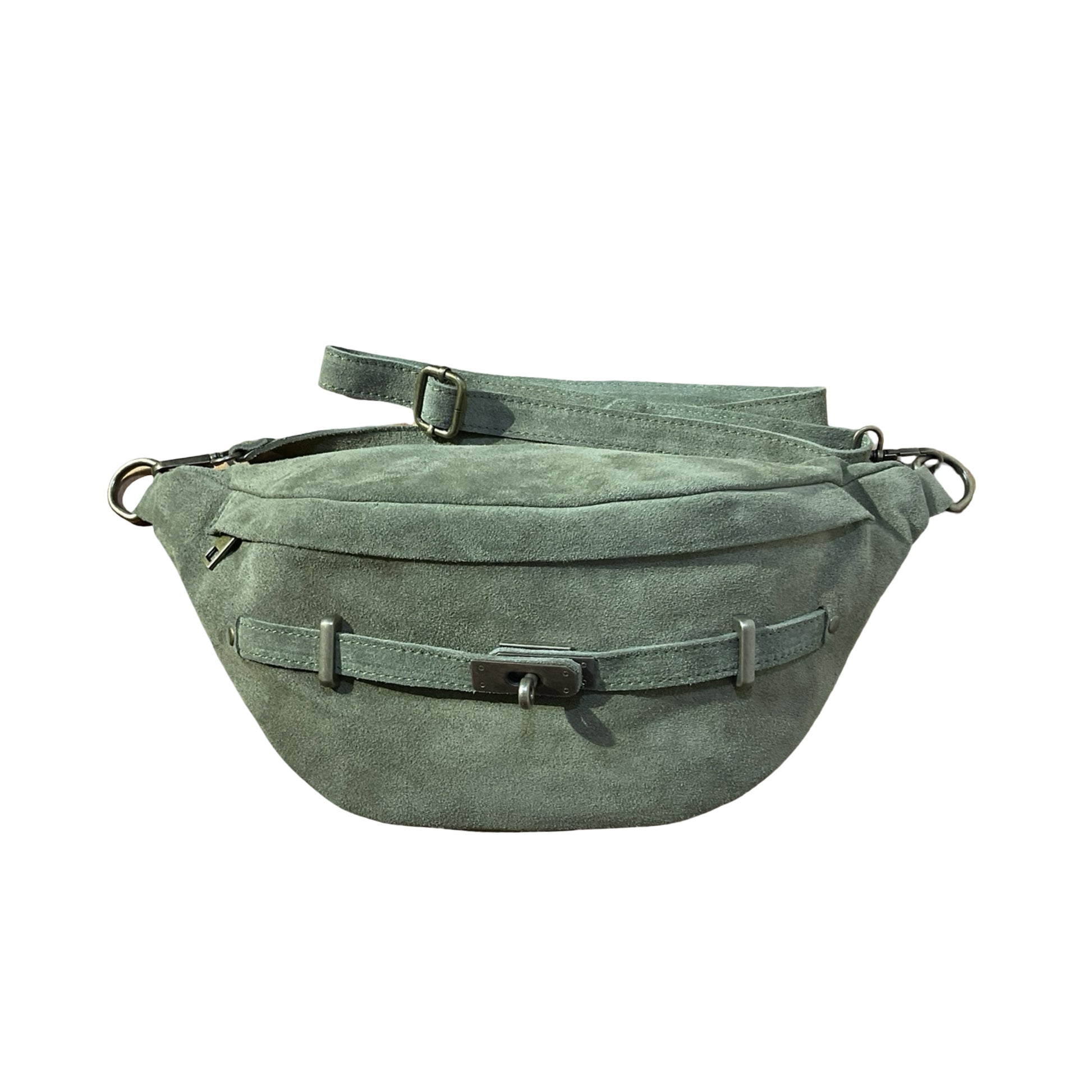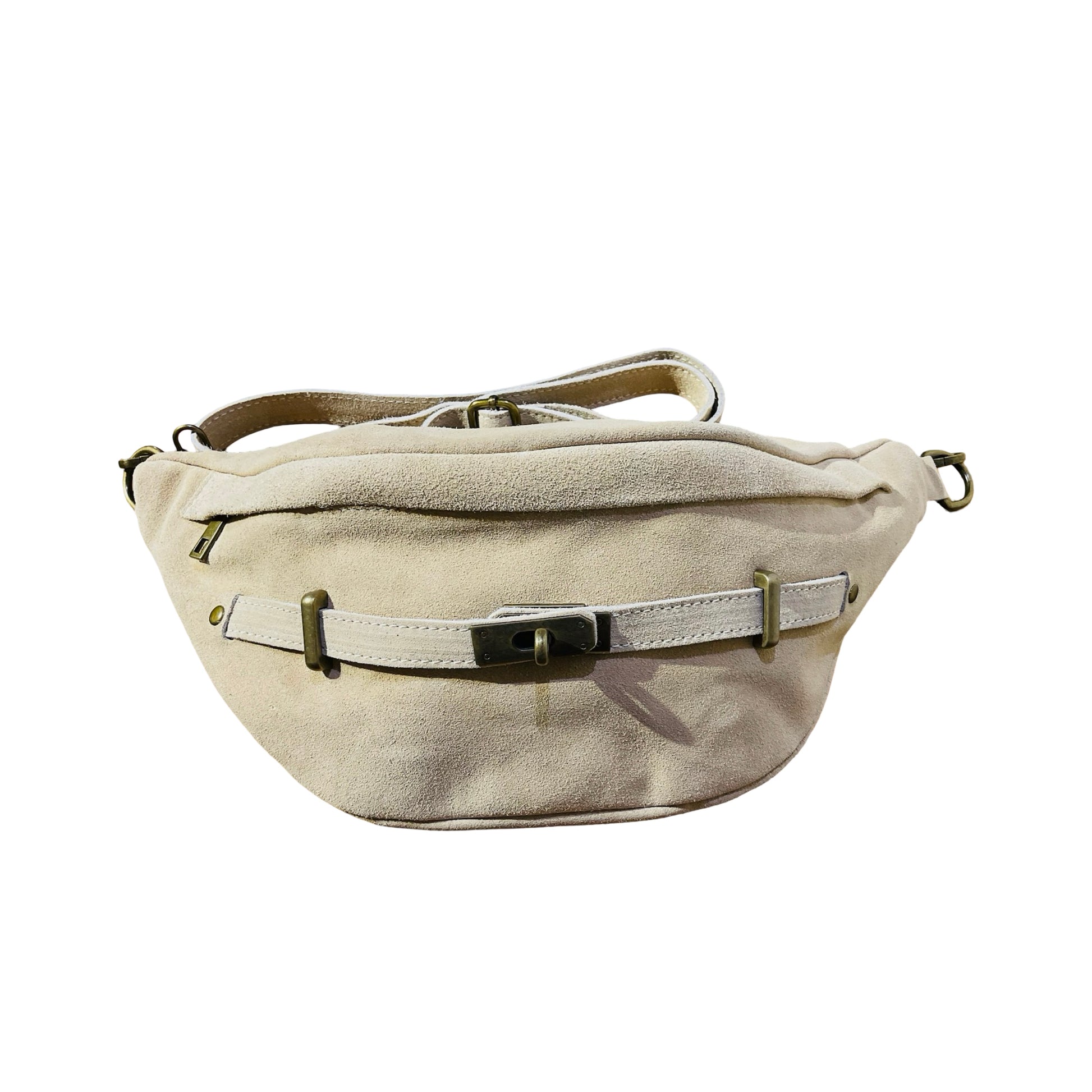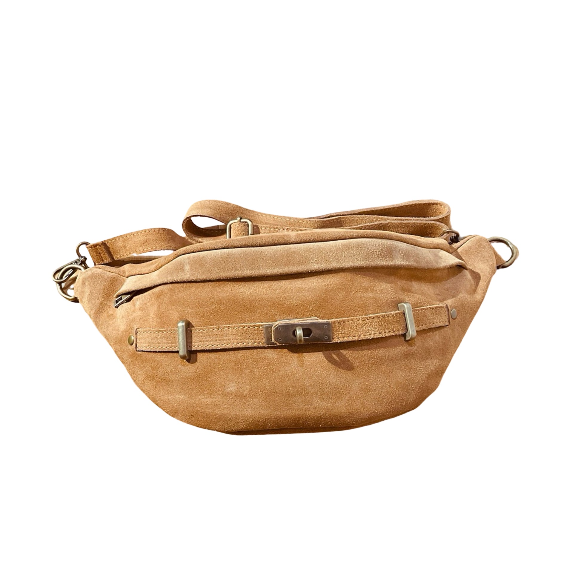 Grand sac banane en cuir suede, élégant et spacieux, avec boucle métallique. Fabrication artisanale italienne, alliant style et praticité.