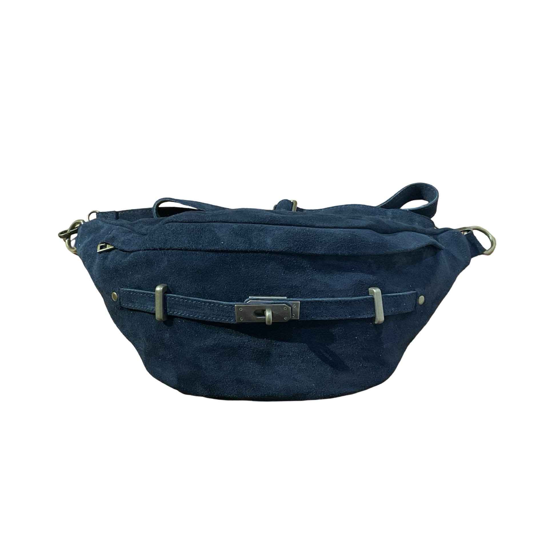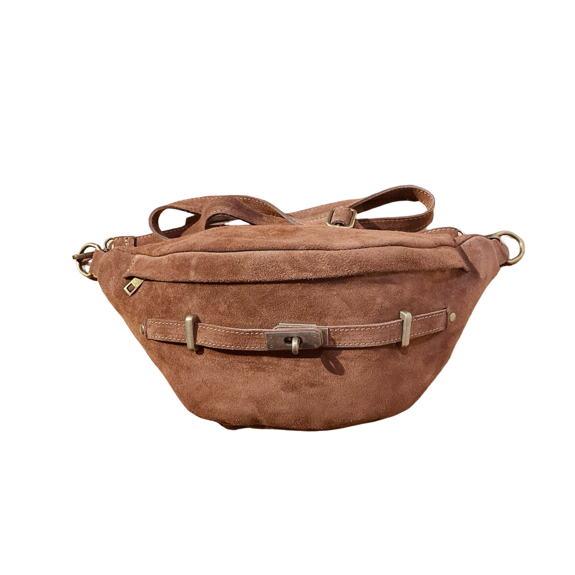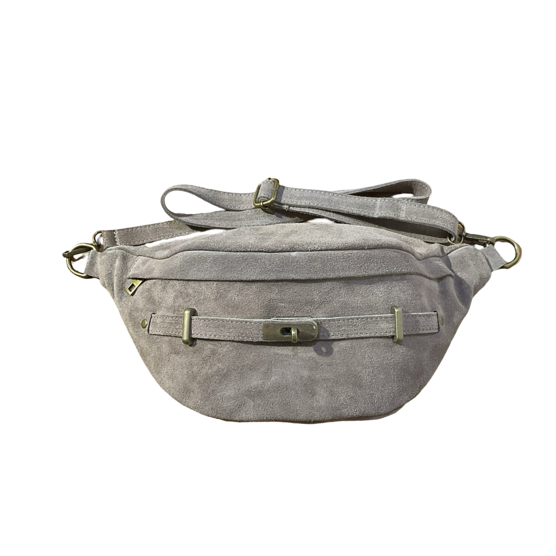 Grand sac banane en cuir suede, élégant et spacieux, avec boucle métallique. Fabrication artisanale italienne, alliant style et praticité.