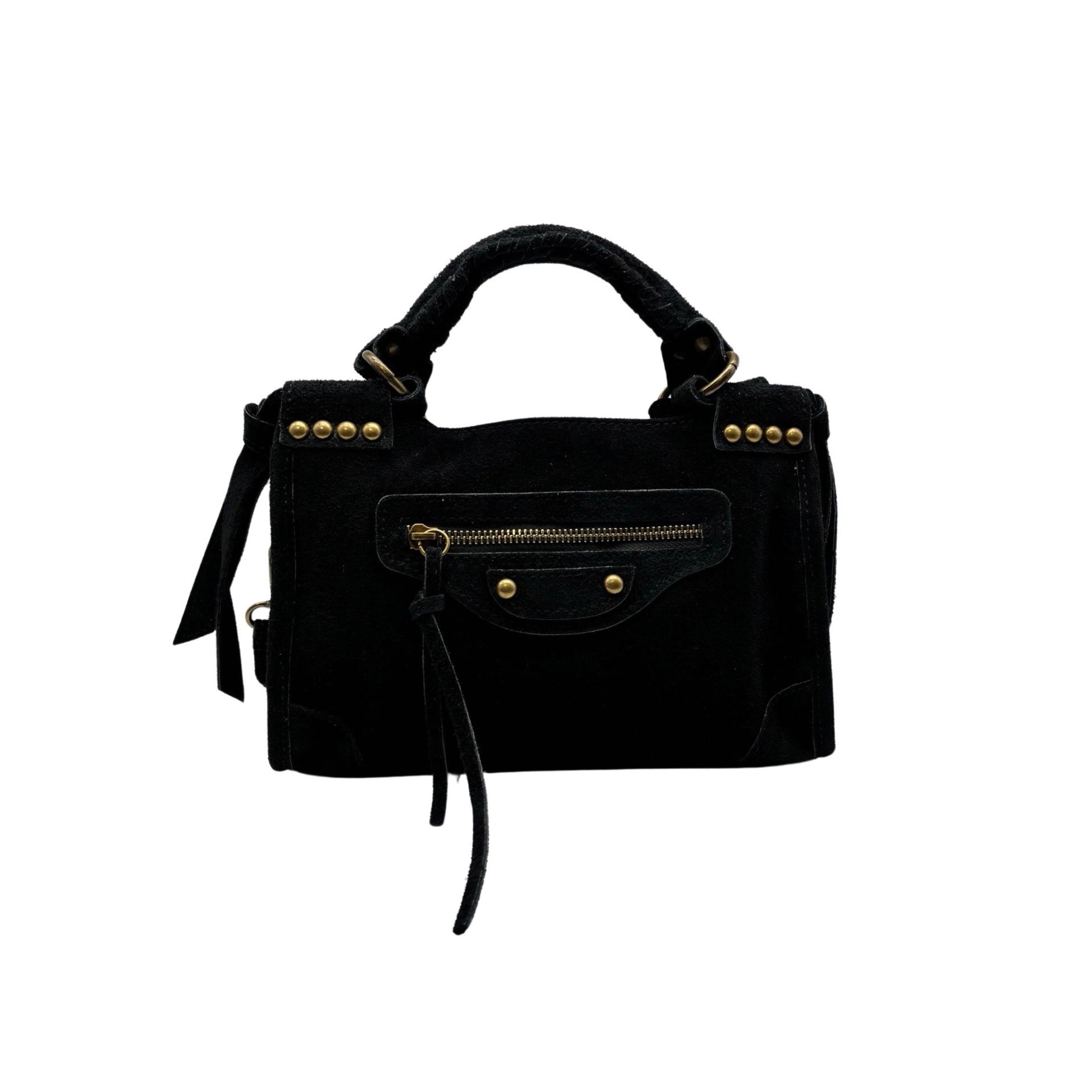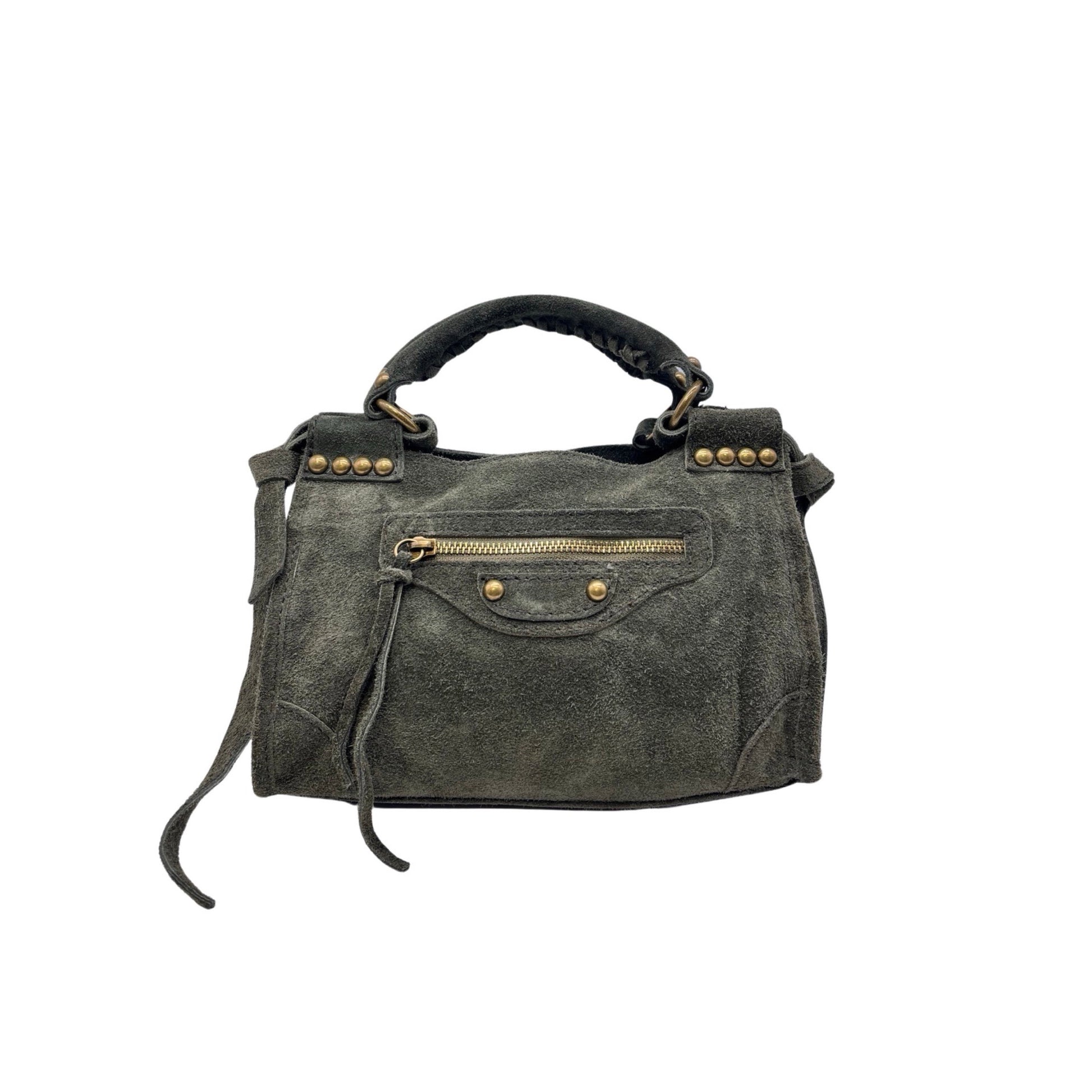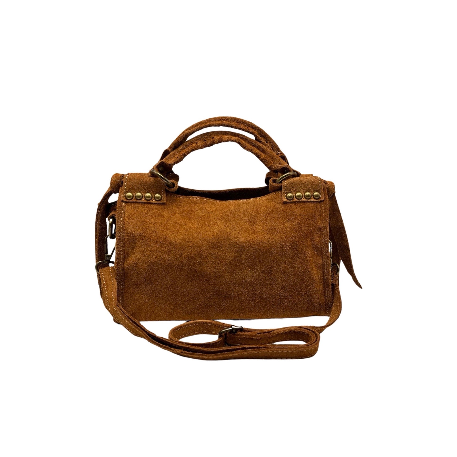 Le sac Olaya en cuir suédé clouté, avec une finition bronze antique, est fabriqué en Italie. Cet accessoire combine élégance et robustesse grâce à la qualité artisanale italienne, parfait pour ajouter une touche de sophistication à votre tenue.