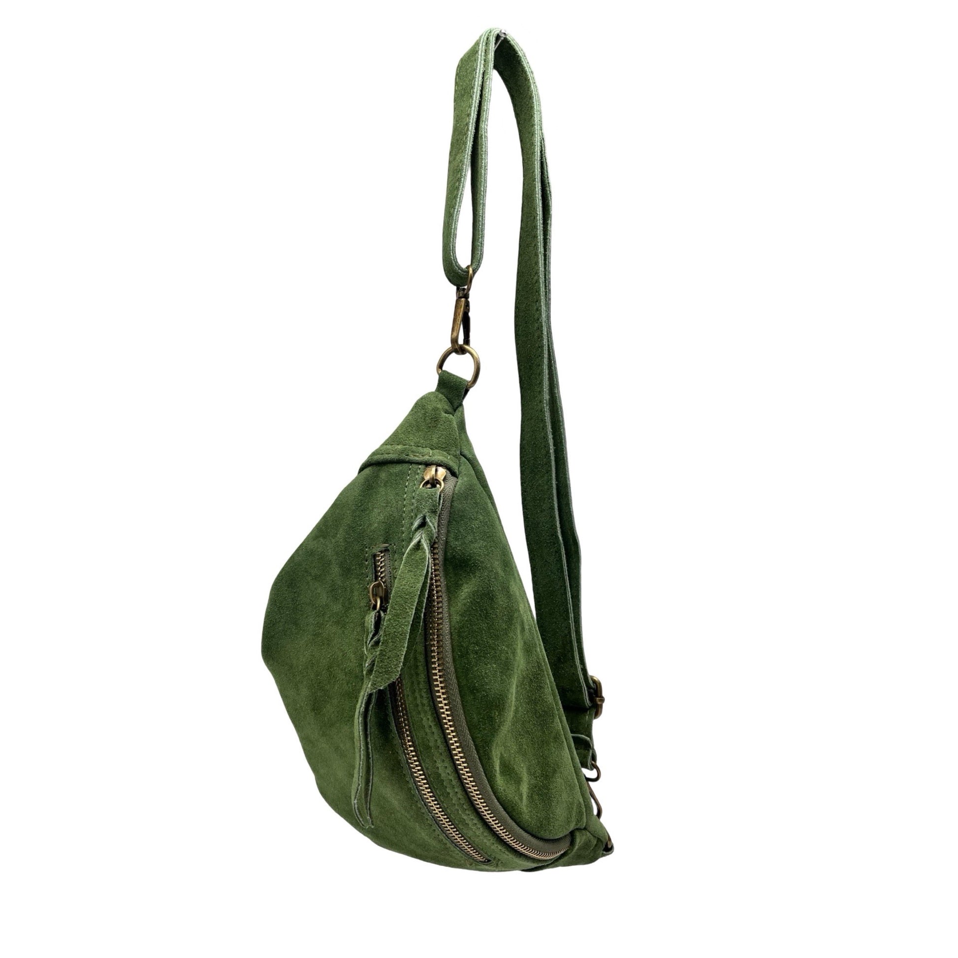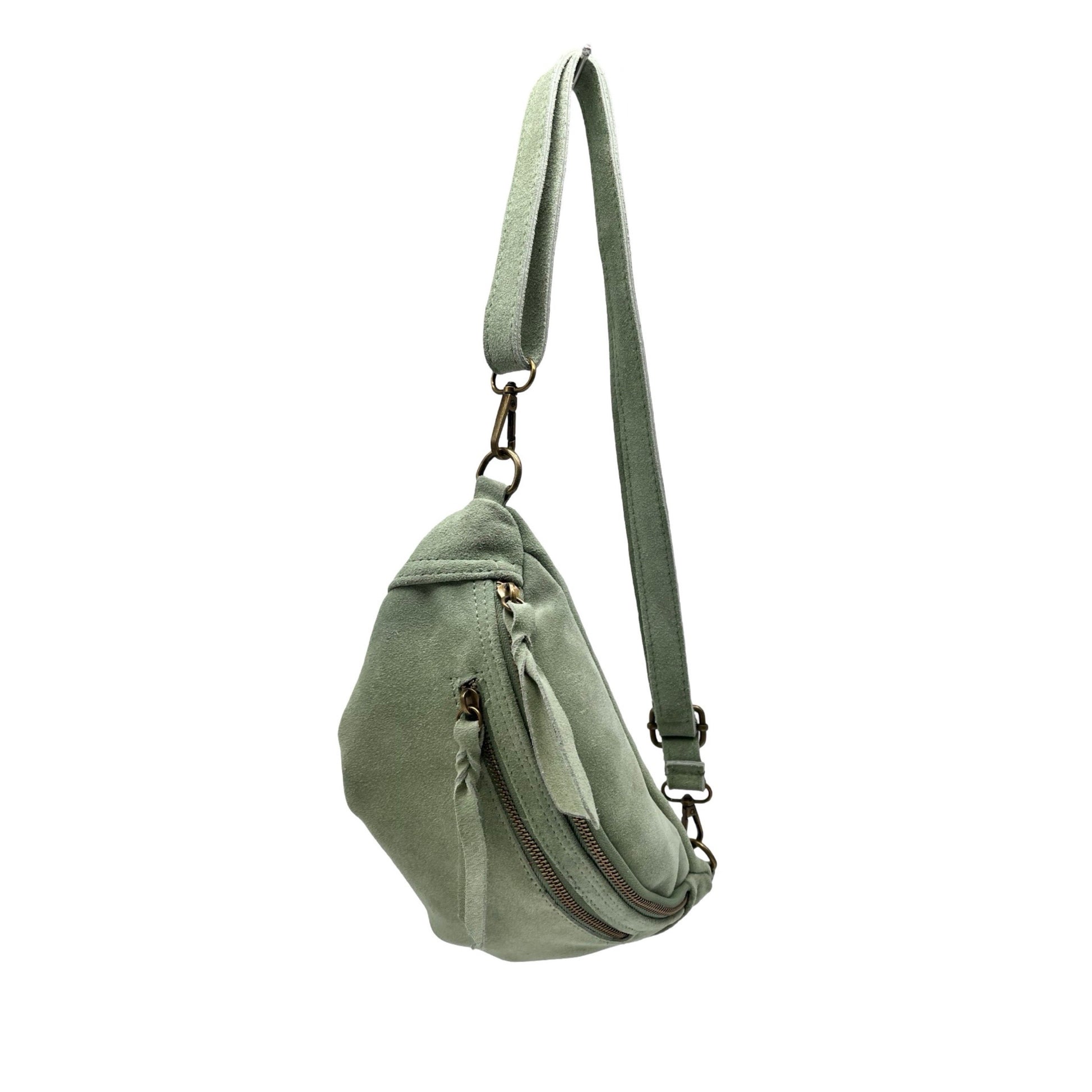 Sac banane en cuir de vachette daim, double fermeture , Fabriqué avec soin en Italie, ce sac allie style et fonctionnalité. La finition métallique dore ajoute une touche sophistiquée, parfaite pour compléter votre look avec une note de glamour et d’élégance. Idéal pour garder vos essentiels à portée de main avec style.