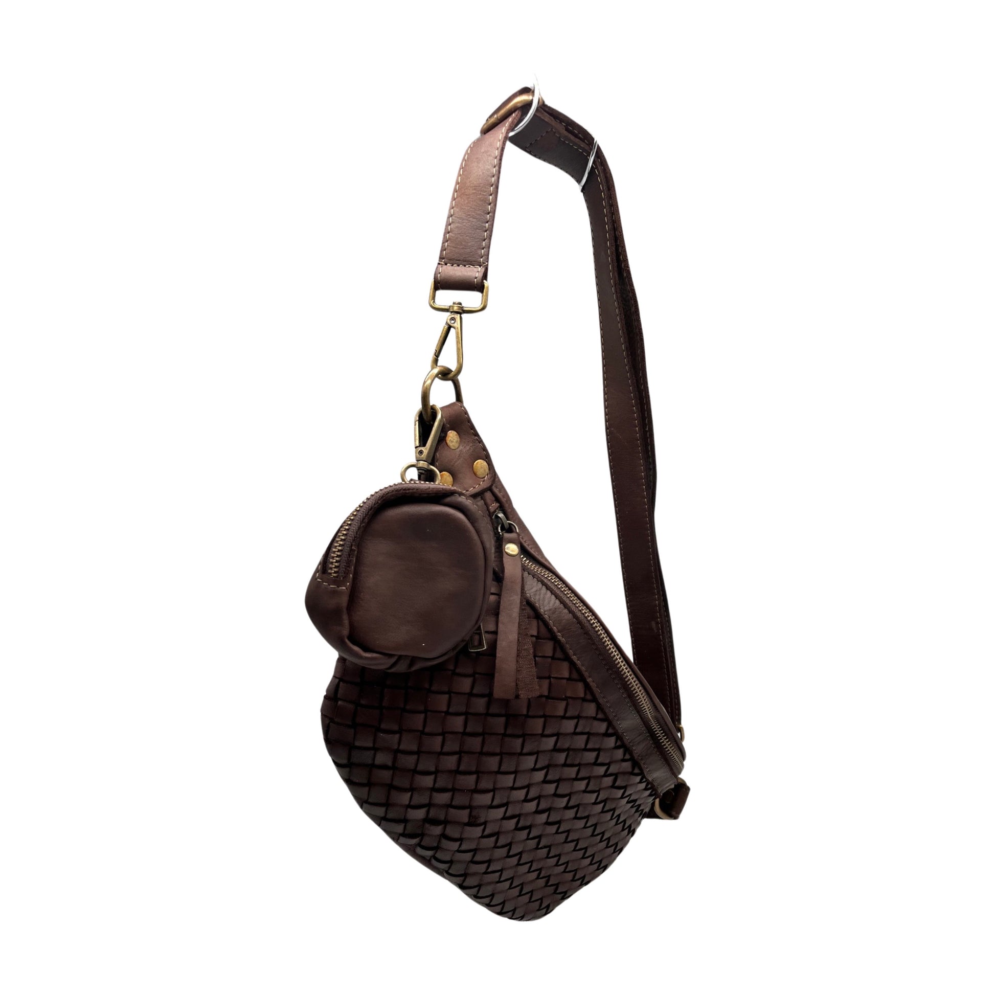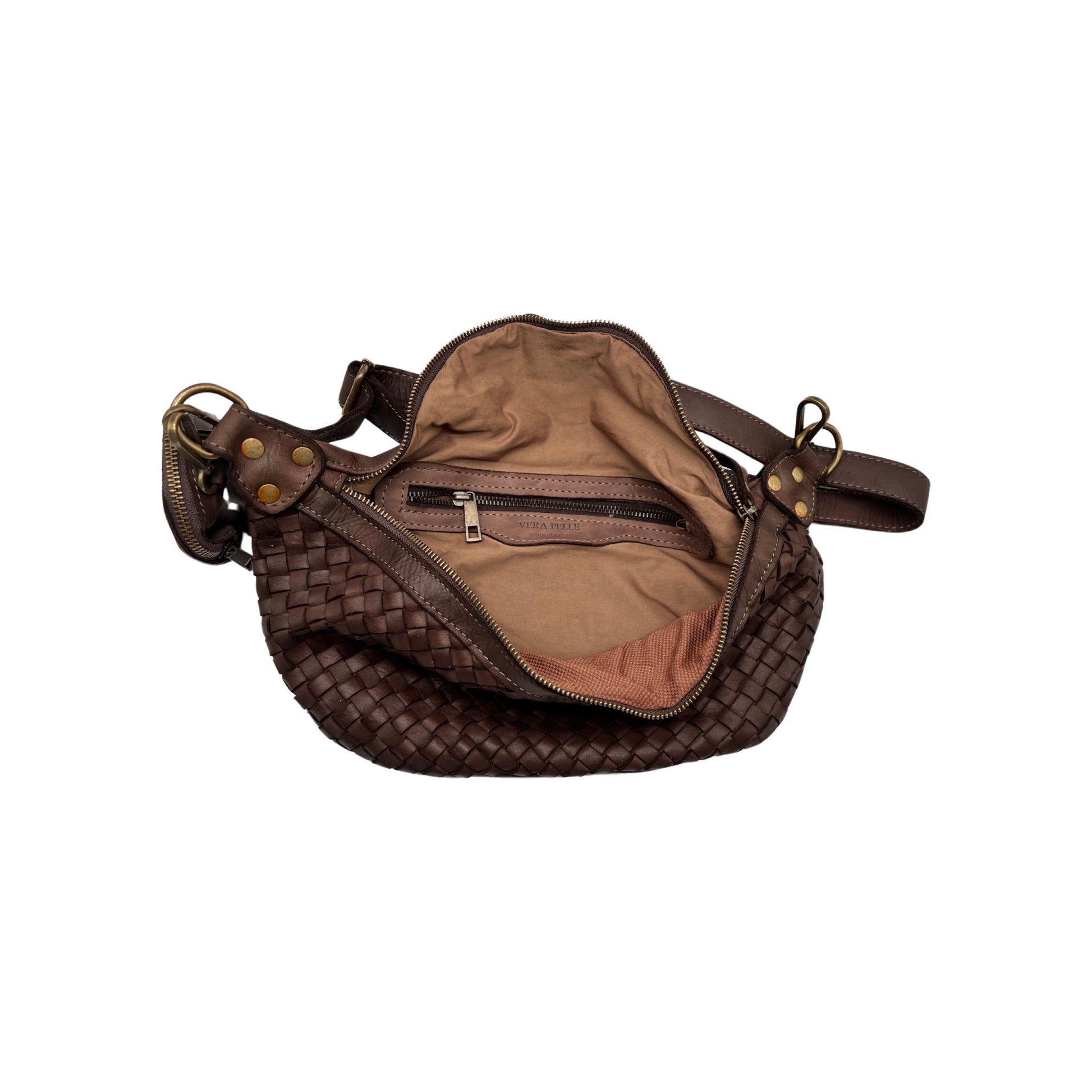 Die Gürteltasche Ambra aus gewaschenem Rindsleder ist eine italienische Kreation mit bemerkenswertem Vintage-Stil. Seine einzigartige Flechtung verleiht ihm einen Hauch von Originalität. Praktisch und elegant ist es das ideale Accessoire für einen trendigen Look.