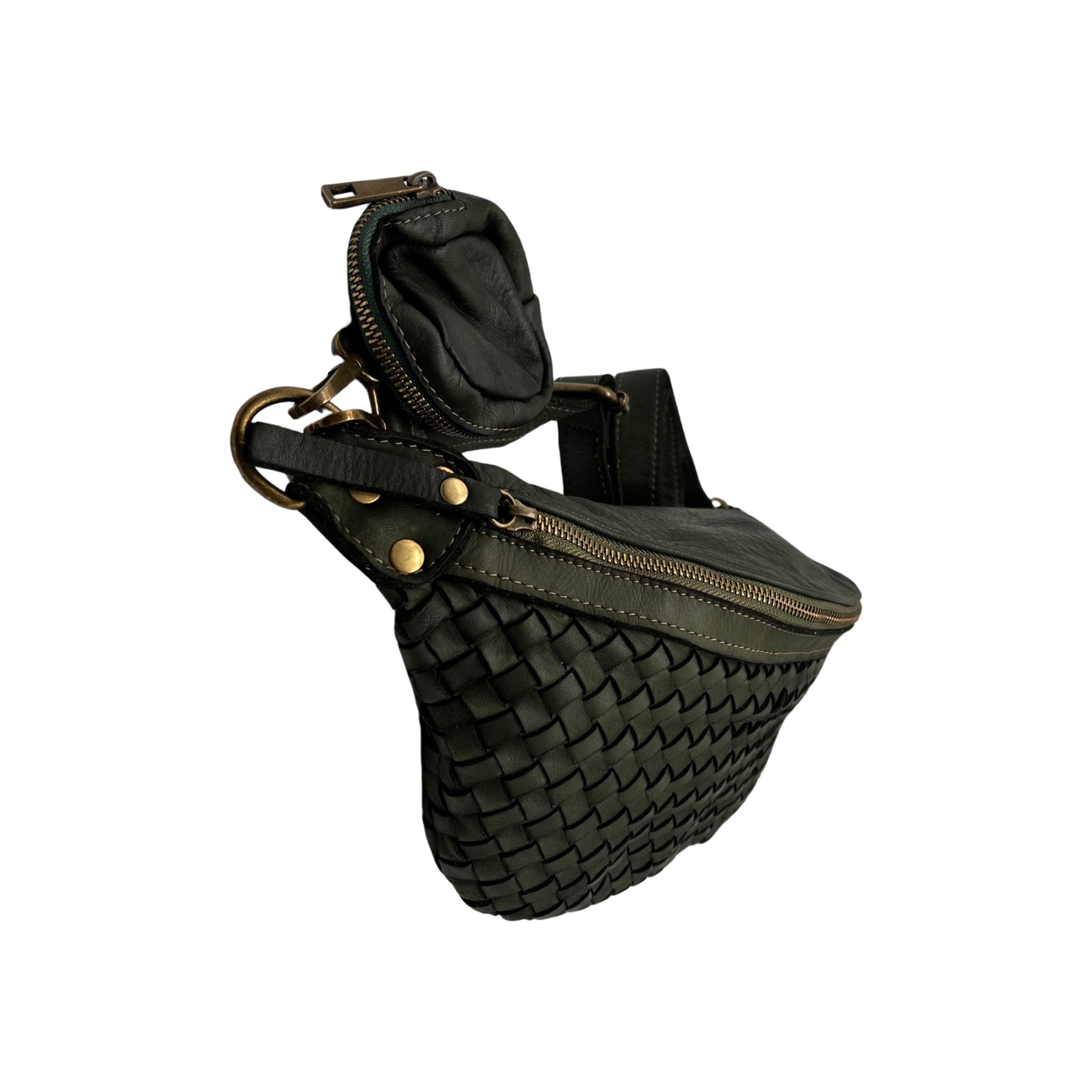 Die Gürteltasche Ambra aus gewaschenem Rindsleder ist eine italienische Kreation mit bemerkenswertem Vintage-Stil. Seine einzigartige Flechtung verleiht ihm einen Hauch von Originalität. Praktisch und elegant ist es das ideale Accessoire für einen trendigen Look.