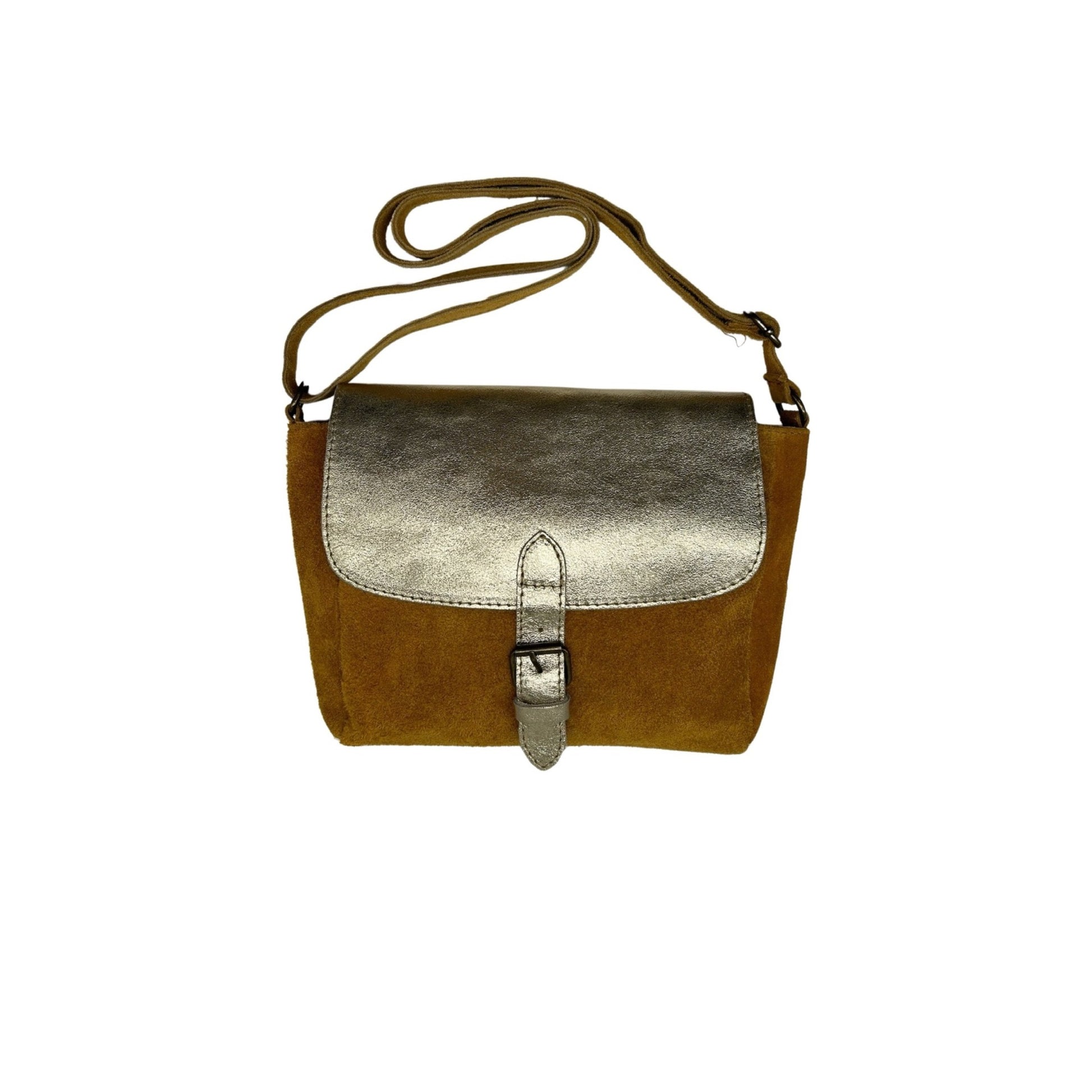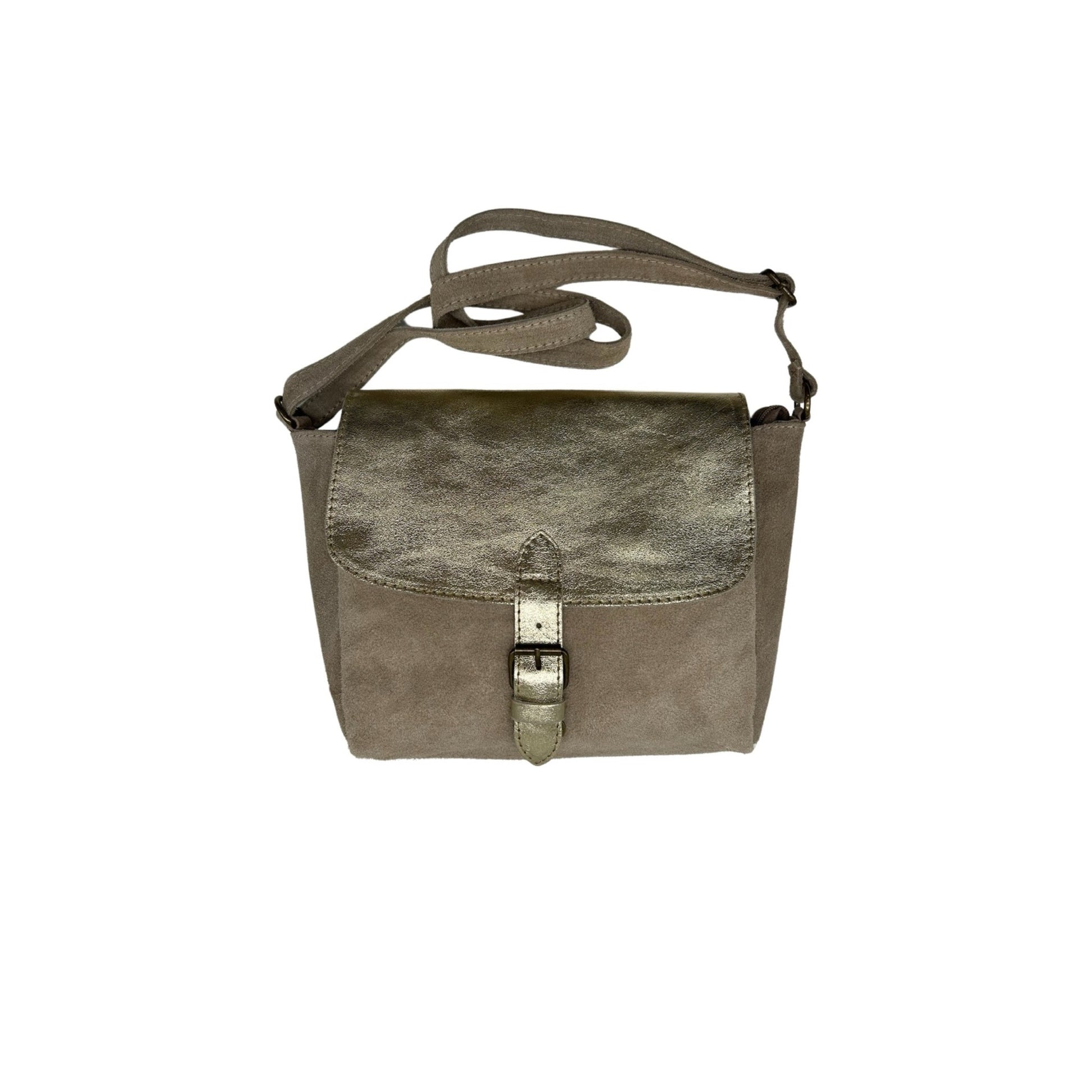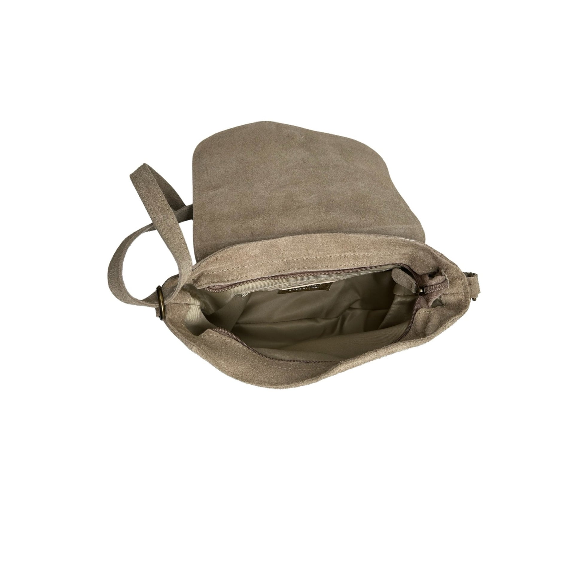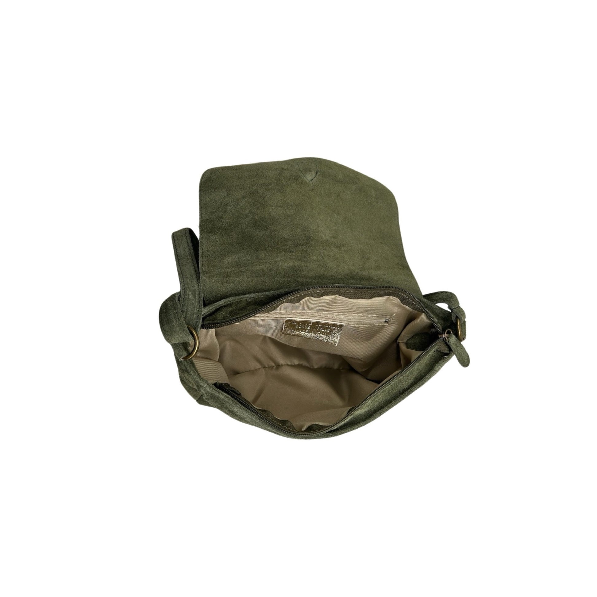 Die in Italien hergestellte Clotilde-Tasche aus Wildleder-Rindsleder ist für das Tragen am ganzen Körper konzipiert. Es ist mit einer schillernden Lederklappe verziert, die diesem italienischen Handwerksaccessoire einen Hauch von Eleganz und Raffinesse verleiht.