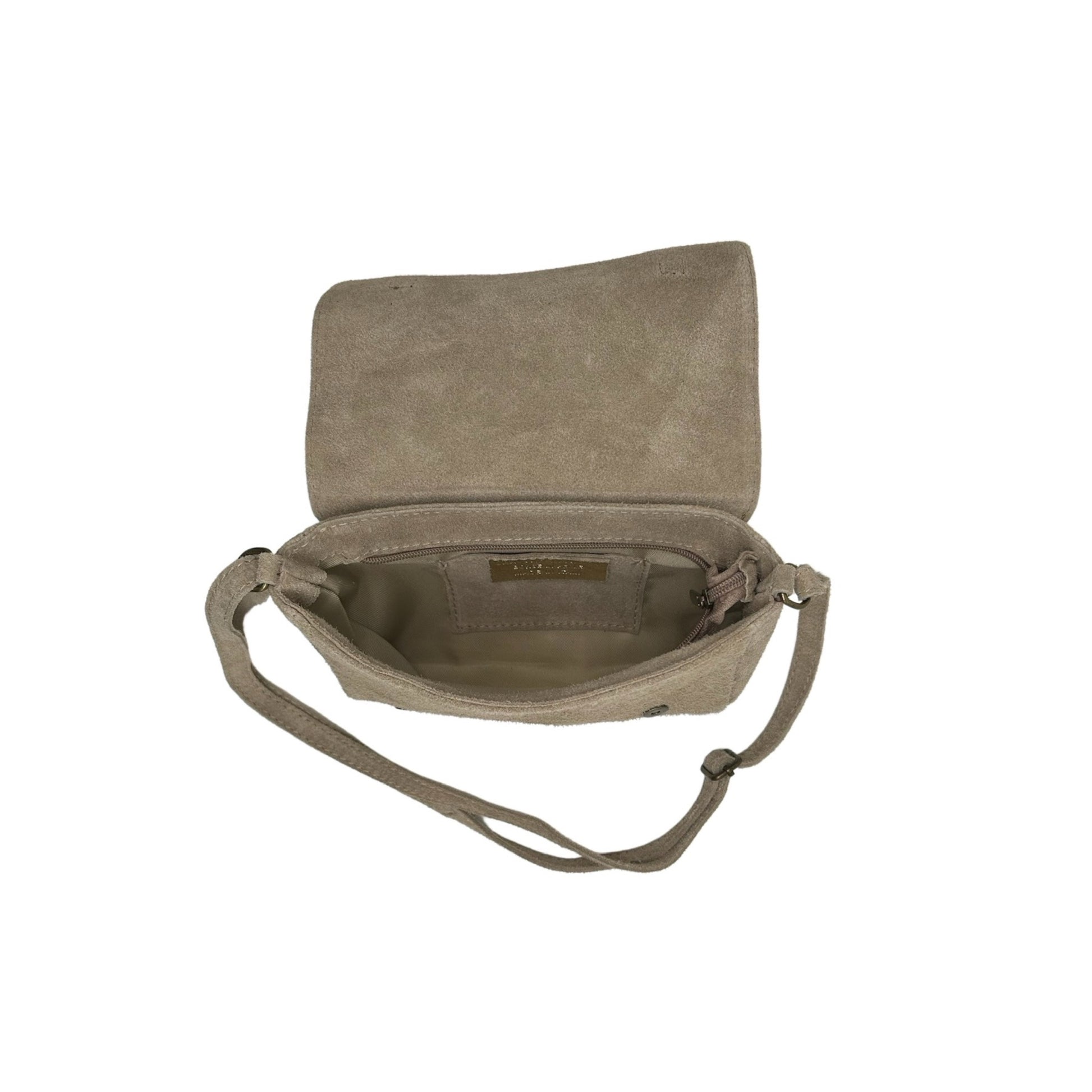 Die kleine Umhängetasche „Elisabeth“, hergestellt in Italien aus Wildleder, ist mit schillernden Lederdetails verziert. Dieser Mix aus Texturen und Oberflächen verleiht diesem Accessoire eine einzigartige Eleganz, perfekt, um Ihr Outfit mit Stil und Raffinesse zu vervollständigen.