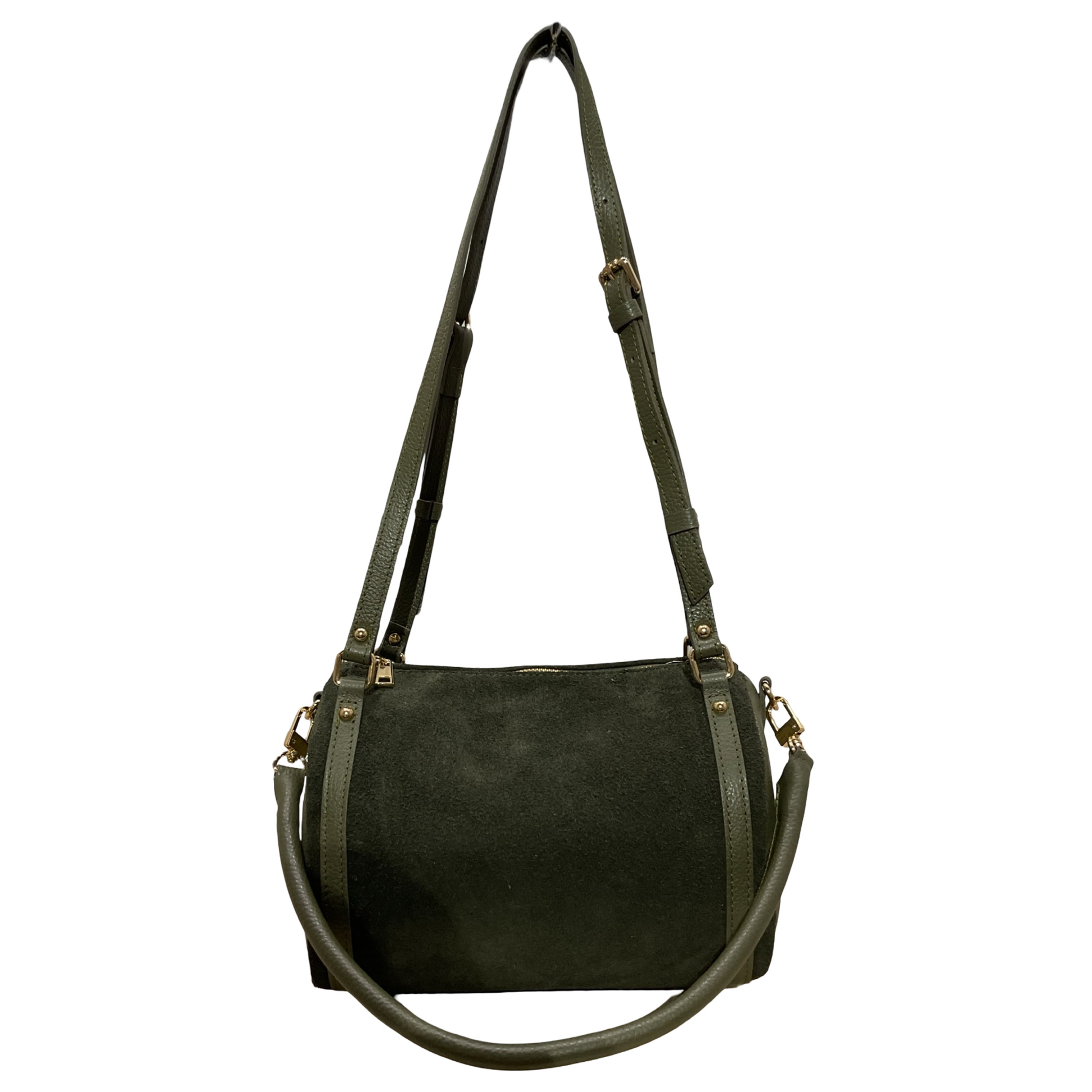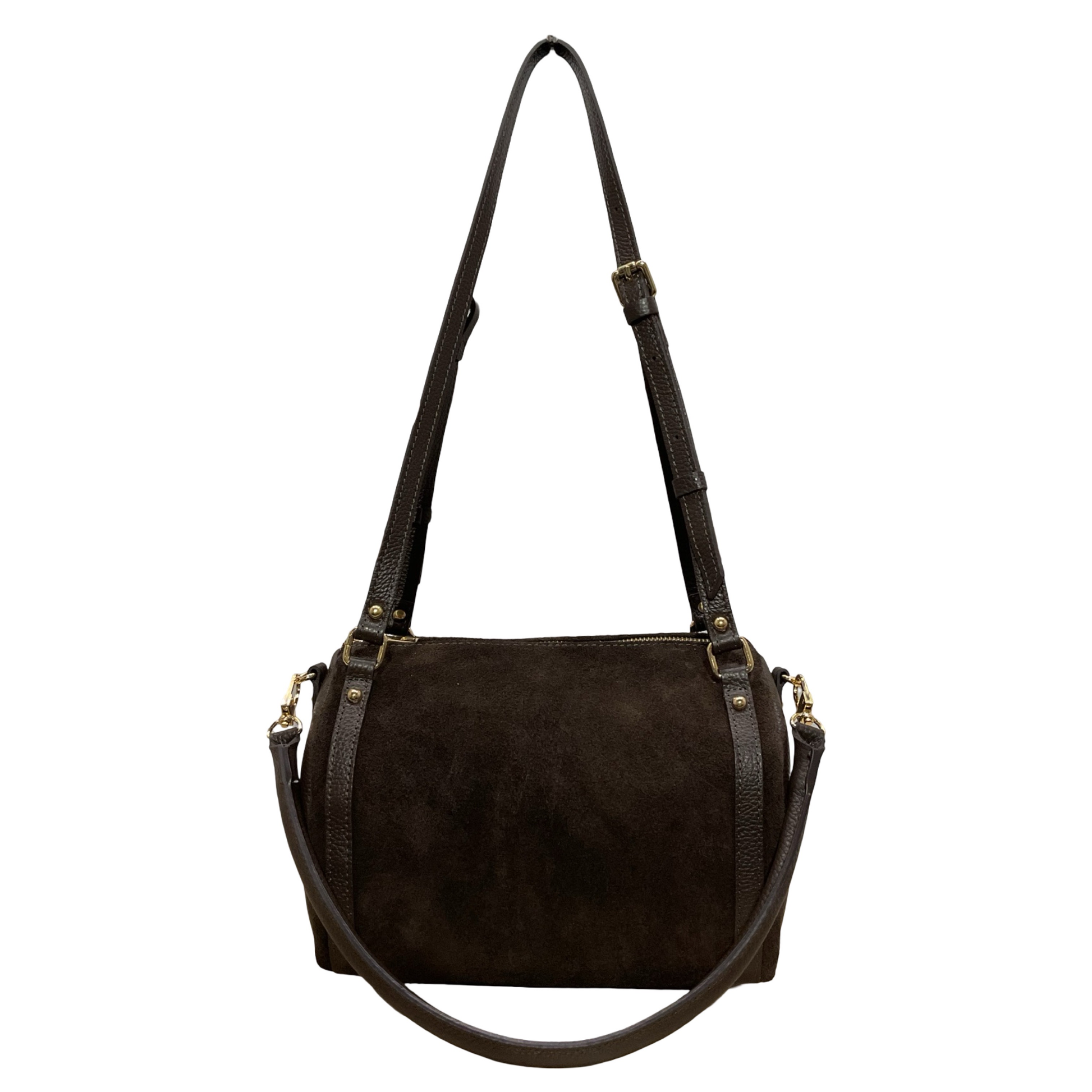 Ce sac à la forme bowling, confectionné en suédine riche et profonde, est contrasté par des détails en simili-cuir pour une touche chic et intemporelle. Polyvalent et fonctionnel, il est équipé de deux bandoulières amovibles et ajustables pour le porter élégamment à l'épaule ou en travers, s'adaptant à toutes vos tenues.