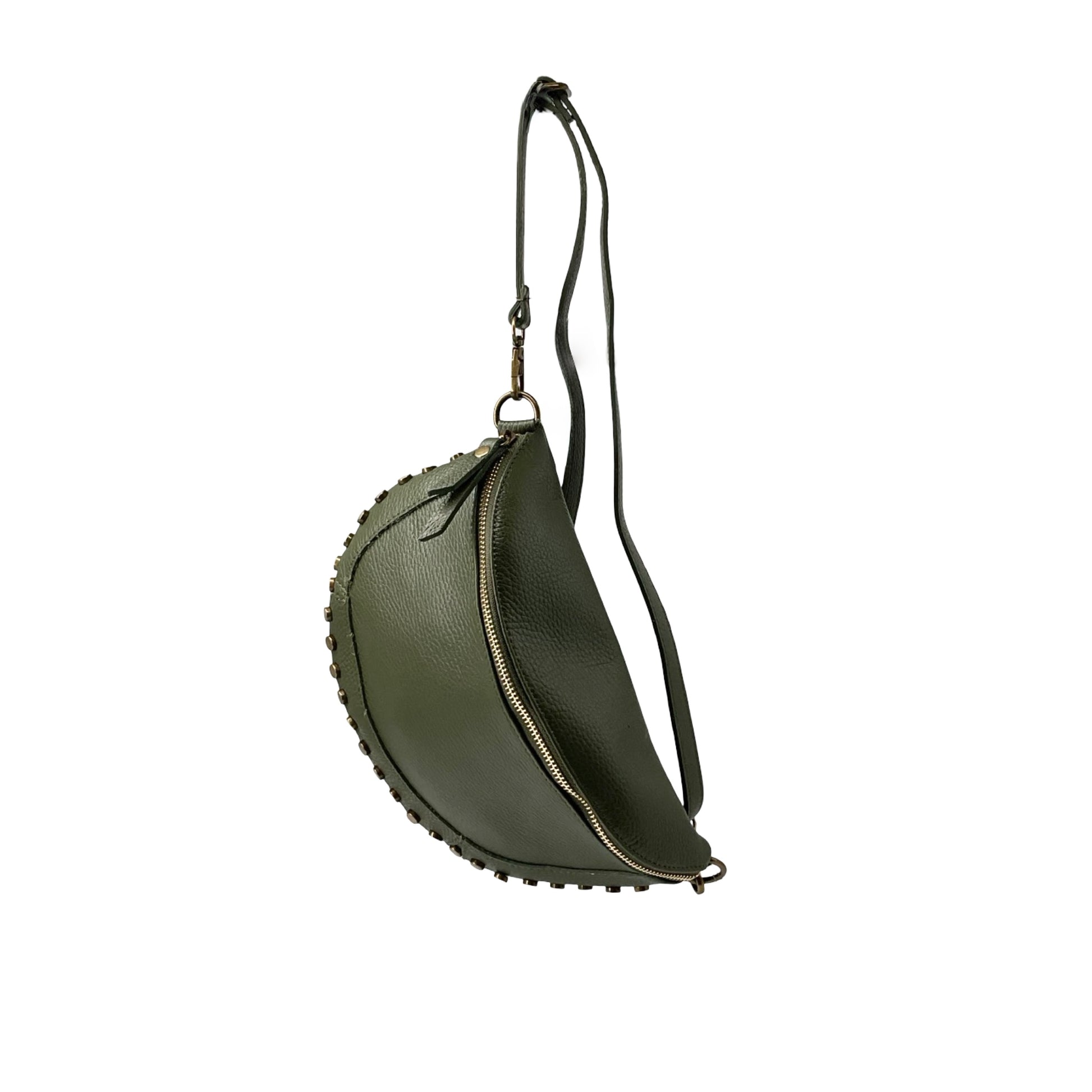 Sac banane en cuir grainé, fabriqué en Italie, orné de clous décoratifs pour une allure moderne et audacieuse. Doté d'une fermeture zippée et d'une bandoulière ajustable, il allie style et praticité pour accompagner vos looks au quotidien.