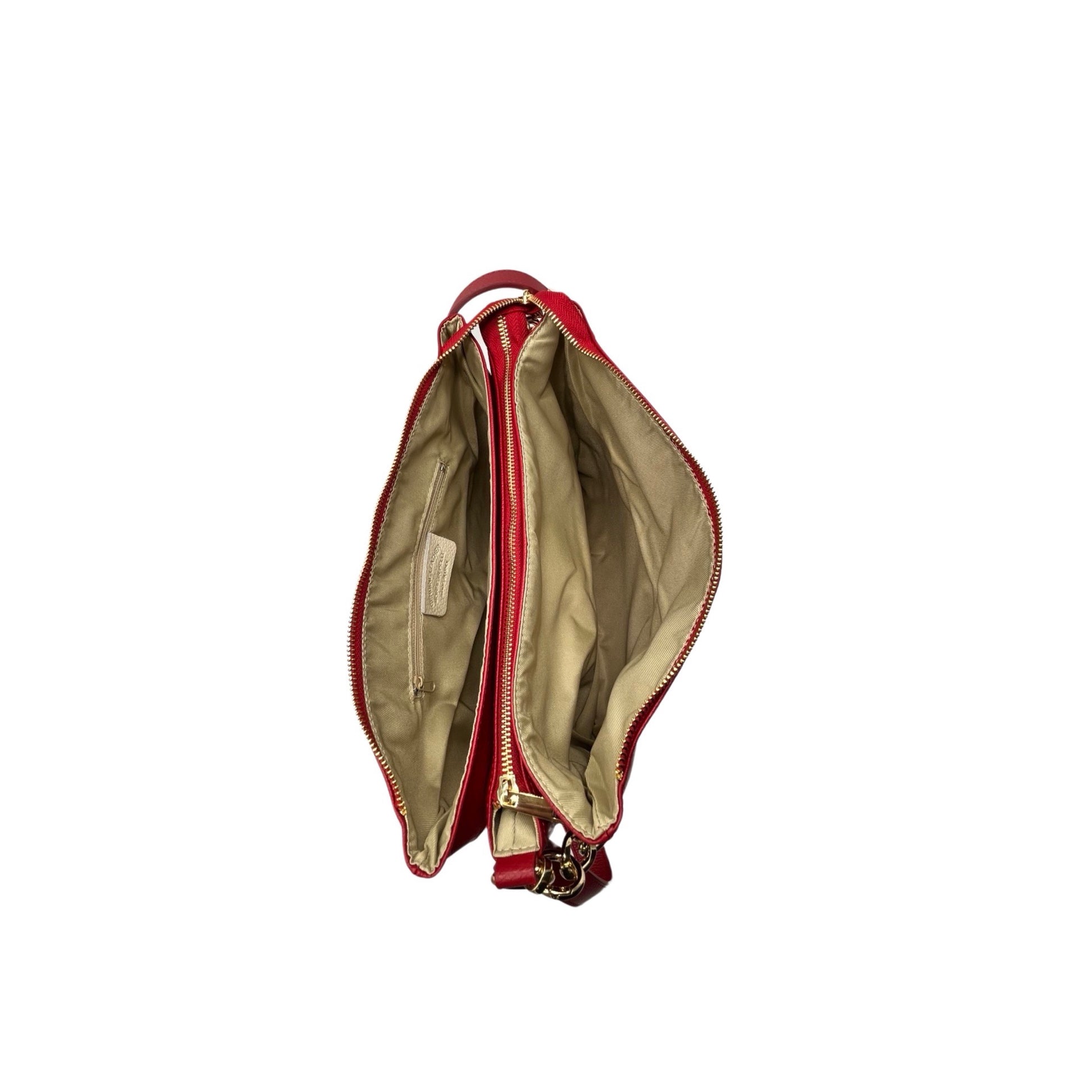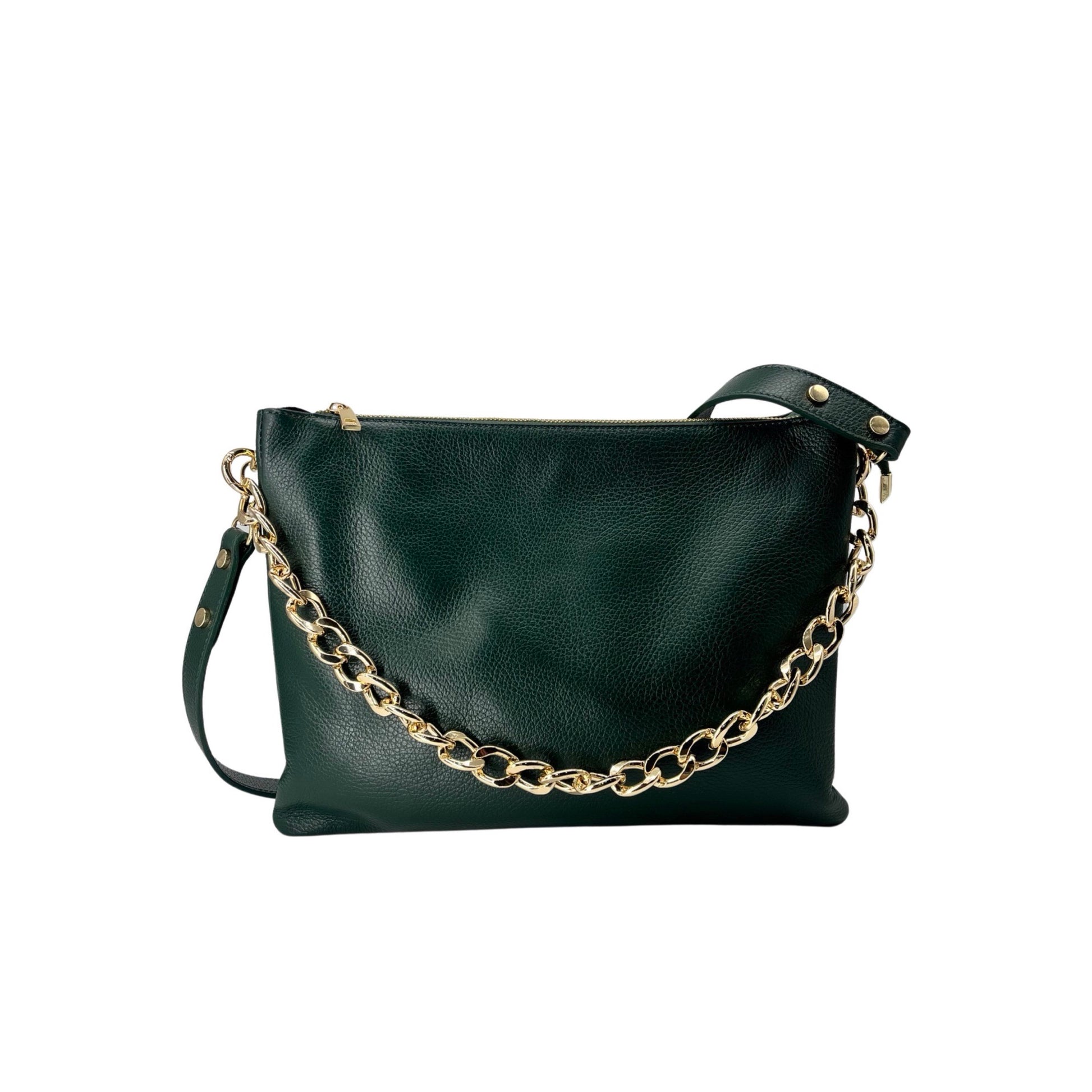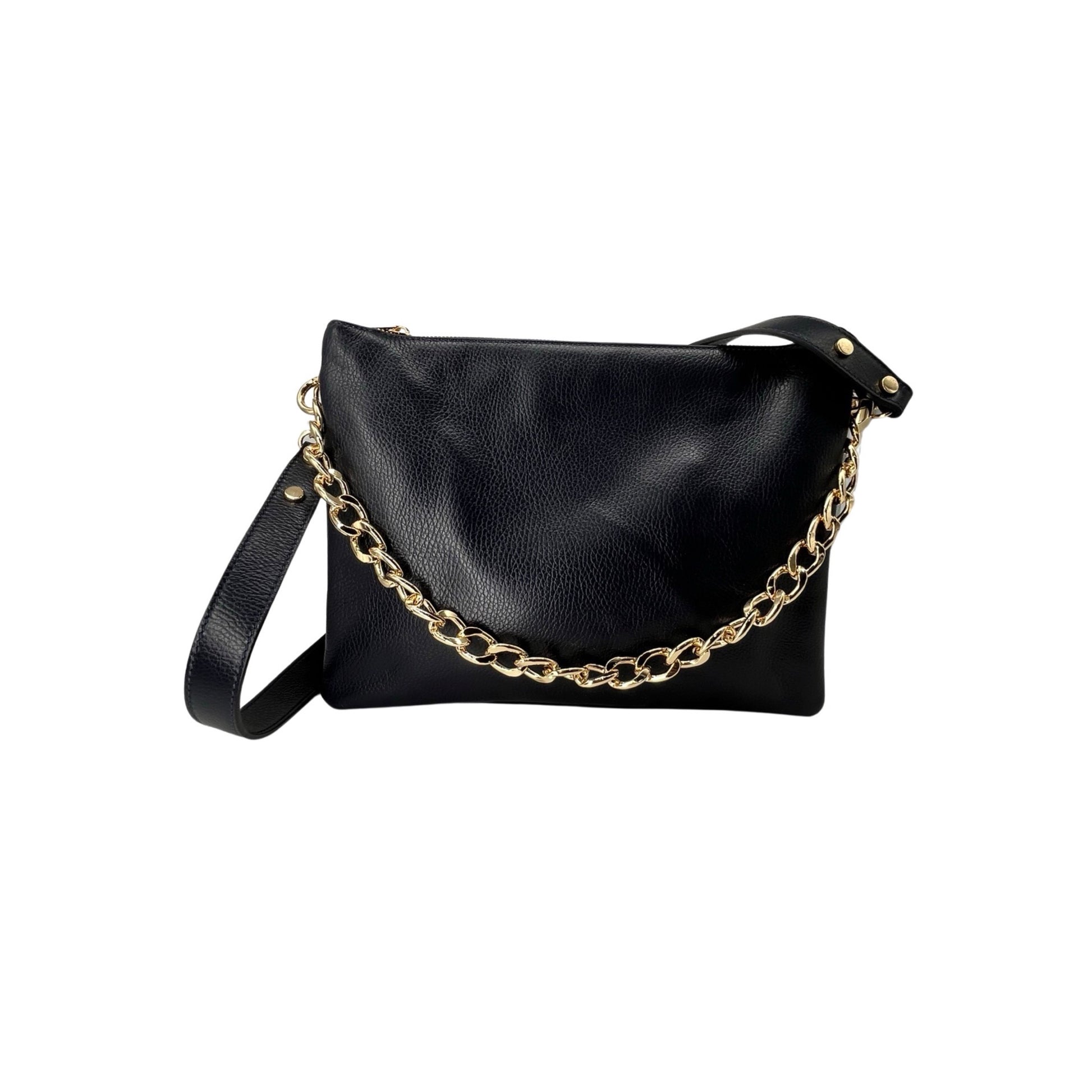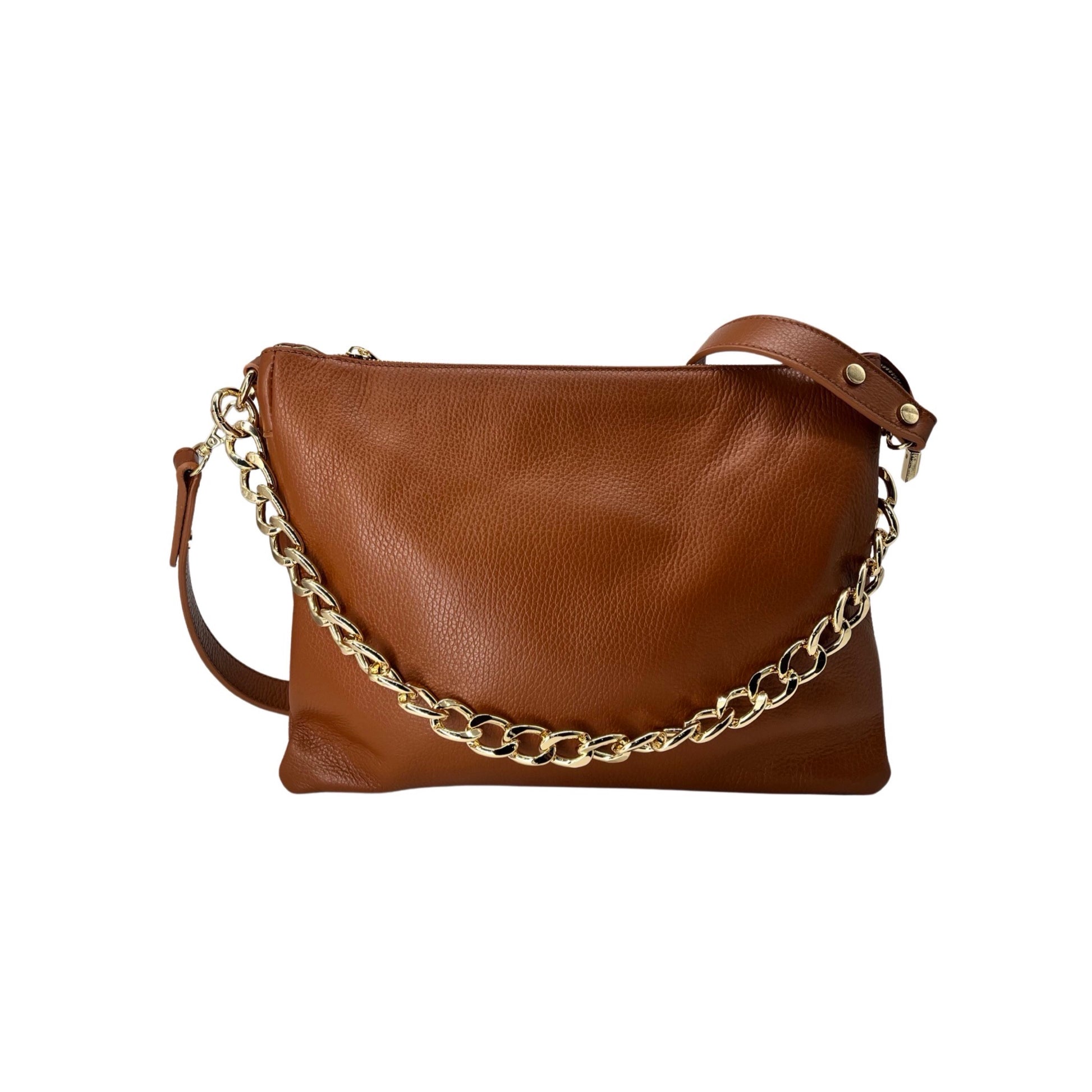 Le sac Josefina , en cuir grainé à trois compartiments, fabriqué en Italie, est équipé de deux bandoulières : une en chaîne métallique et l'autre en cuir. Ses dimensions sont de 32 cm sur 24 cm, offrant à la fois style et fonctionnalité avec la qualité artisanale italienne.