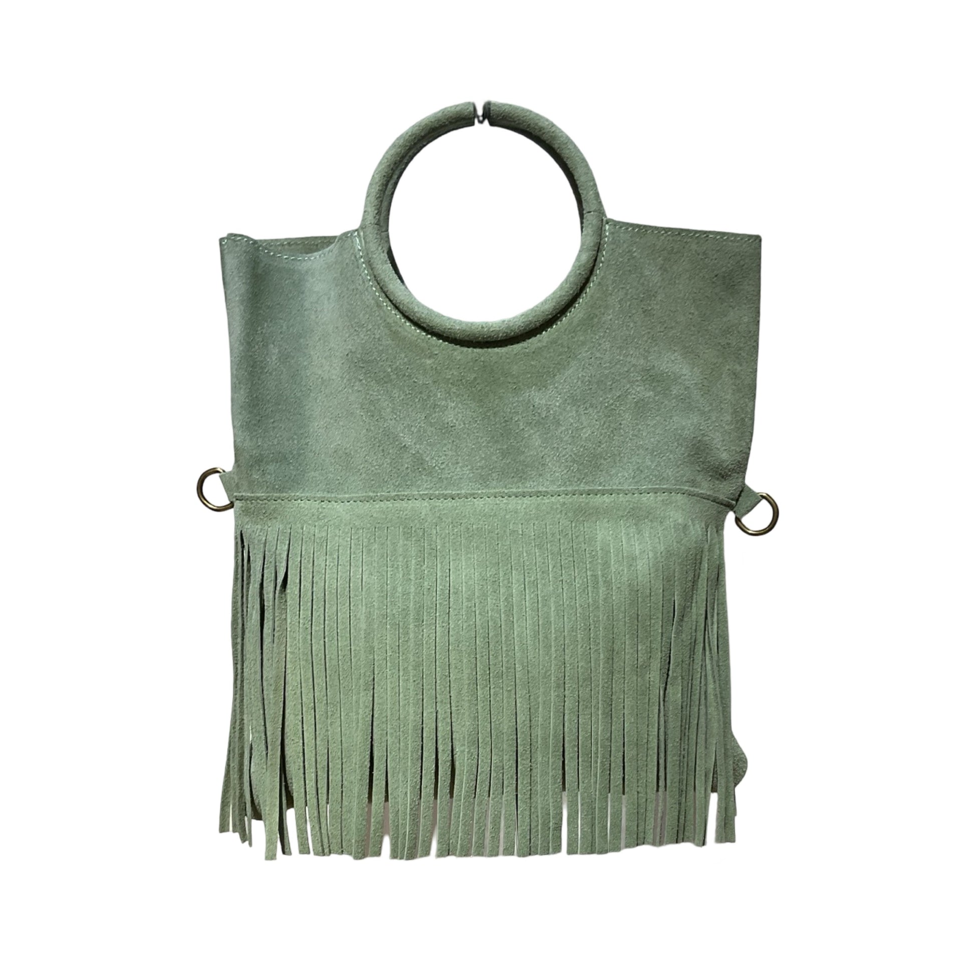 Ce sac élégant et bohème est fabriqué en cuir suédé italien de haute qualité, avec des franges fines pour un style décontracté mais sophistiqué. Le poignet rigide assure une tenue parfaite, tout en restant confortable.