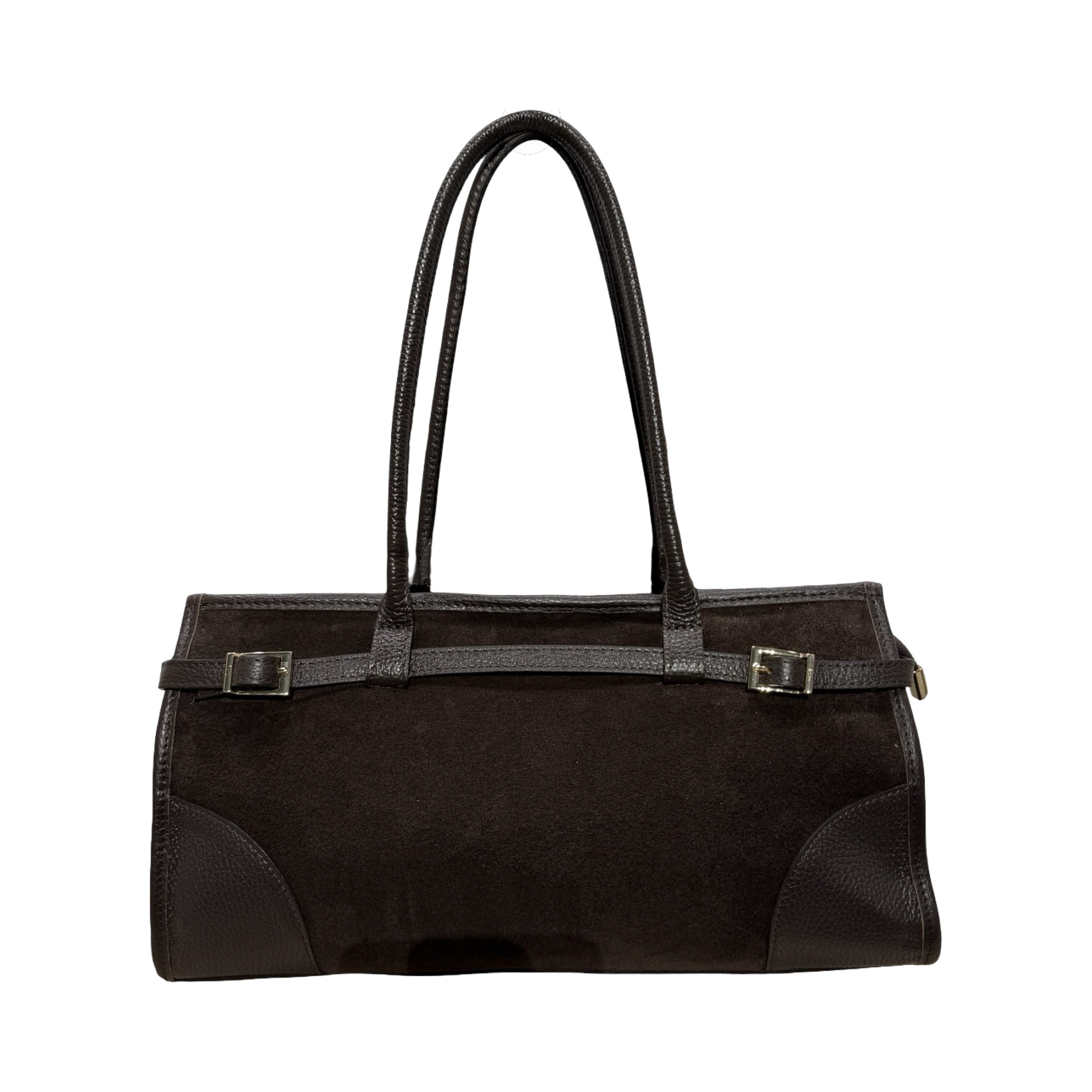 Ce sac allie la douceur luxueuse du suède à la robustesse du cuir grainé, créant un accessoire à la fois chic et durable. Son design rectangulaire, inspiré des sacs baguette, est souligné par des lanières en cuir qui lui confèrent une élégance classique et intemporelle. Idéal pour un porté épaule ou à la main, il est le compagnon parfait pour organiser vos essentiels quotidiens avec style.