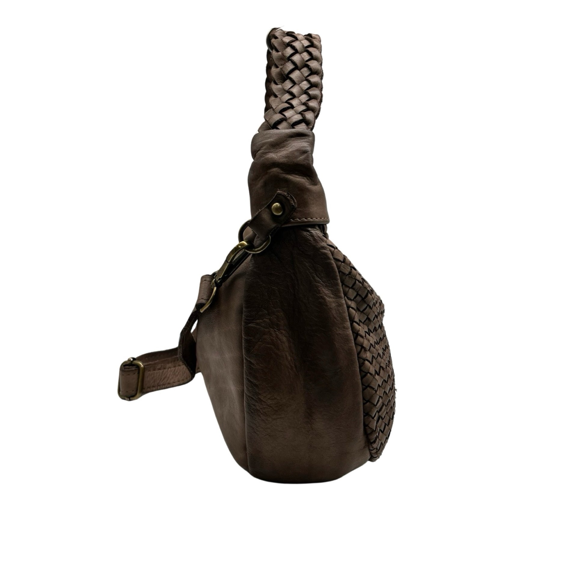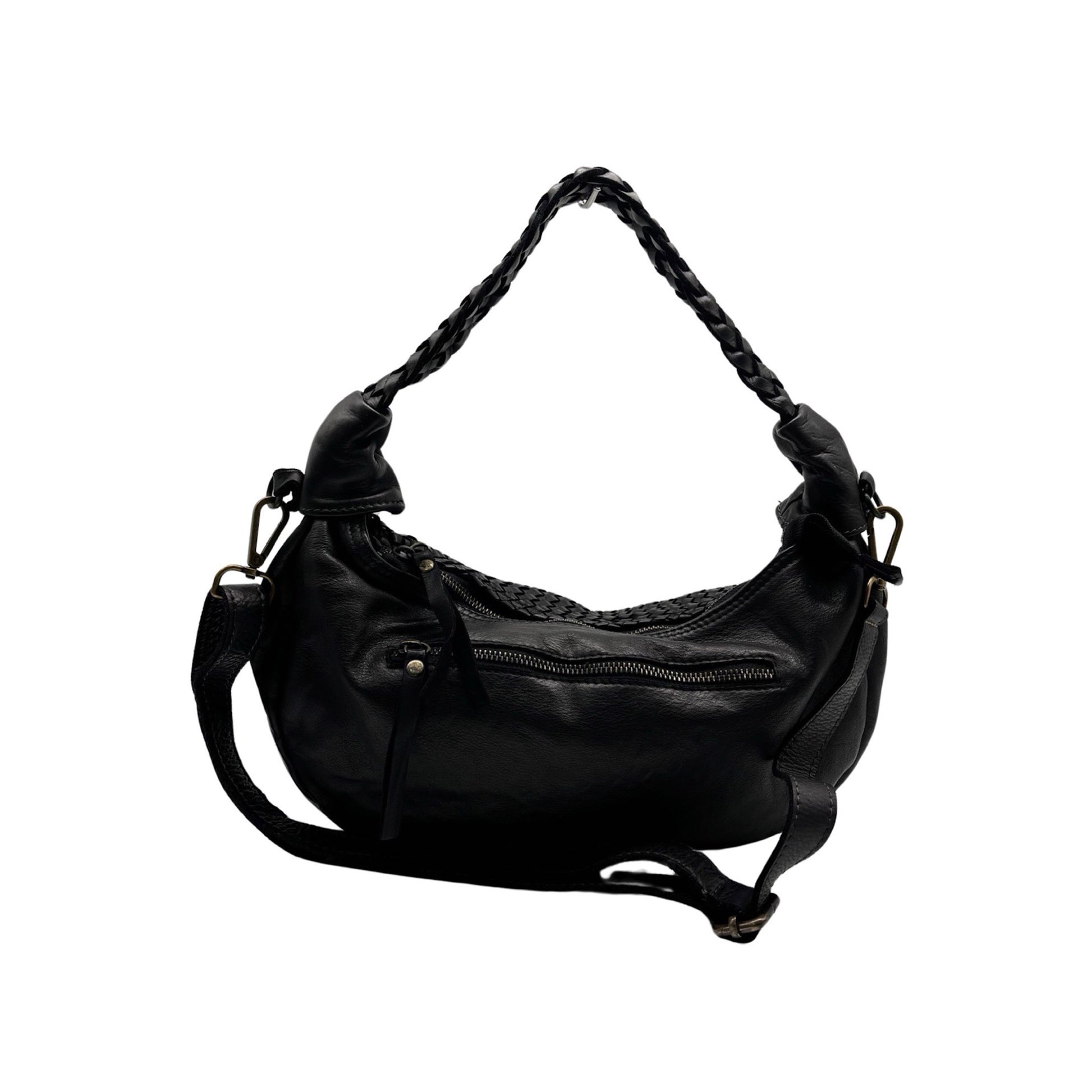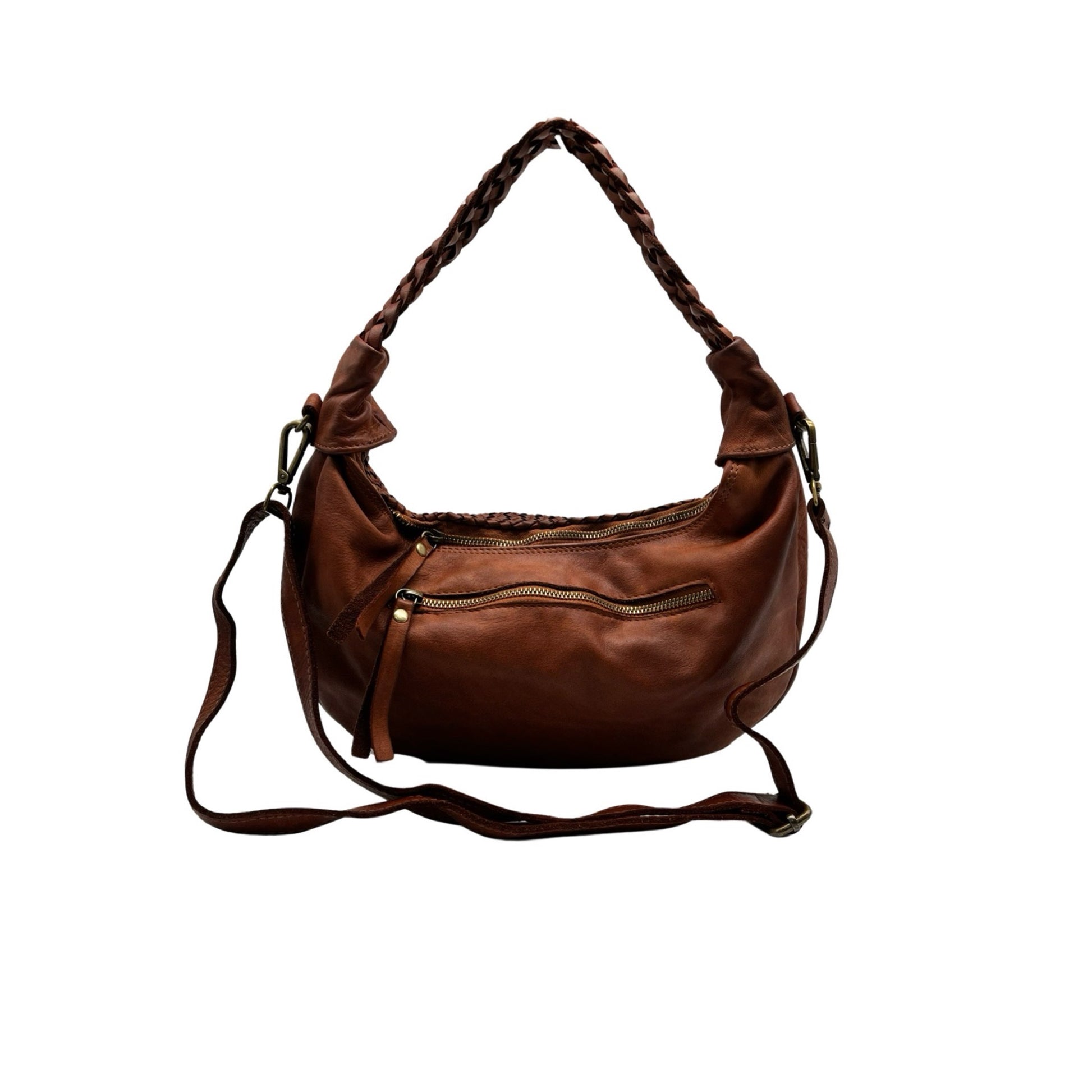 The Alice bag in washed cowhide leather, measuring 35 cm x 21 cm, is made in Italy. With its braiding details on the front and its also braided shoulder strap, it can be worn on the shoulder or across the body. Its vintage style adds a touch of timeless charm to your outfit.