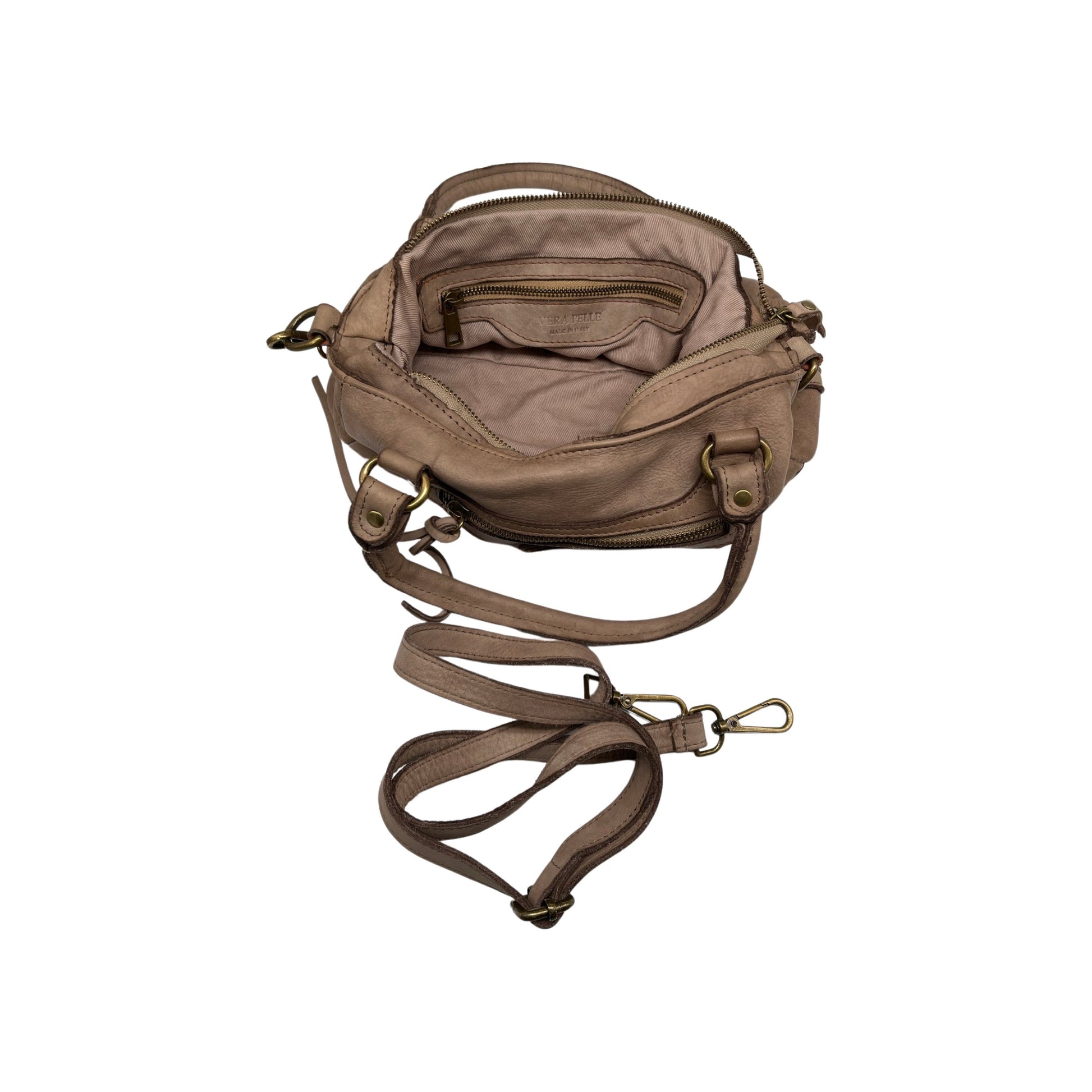 The Lucie bag, in genuine washed cowhide leather with a vintage style and made in Italy, is designed to be carried by hand or across the body. Lined and measuring 30cm x 20cm x 10cm, it offers elegance and practicality for your daily needs.