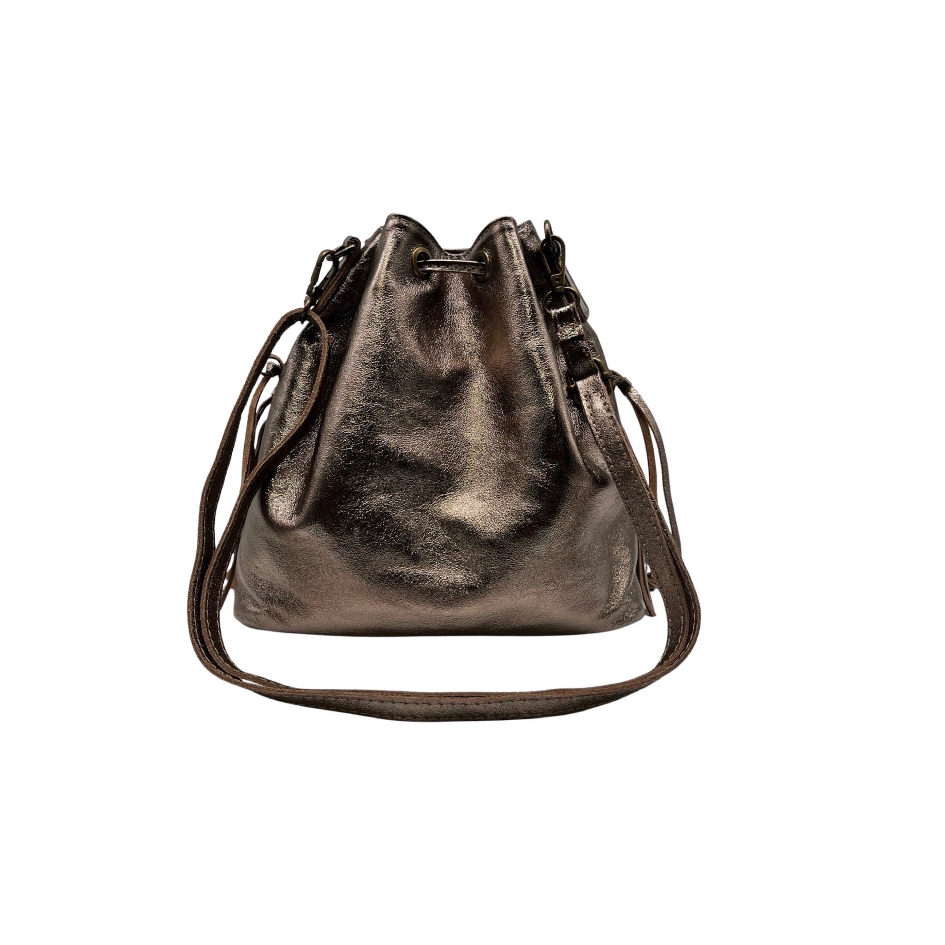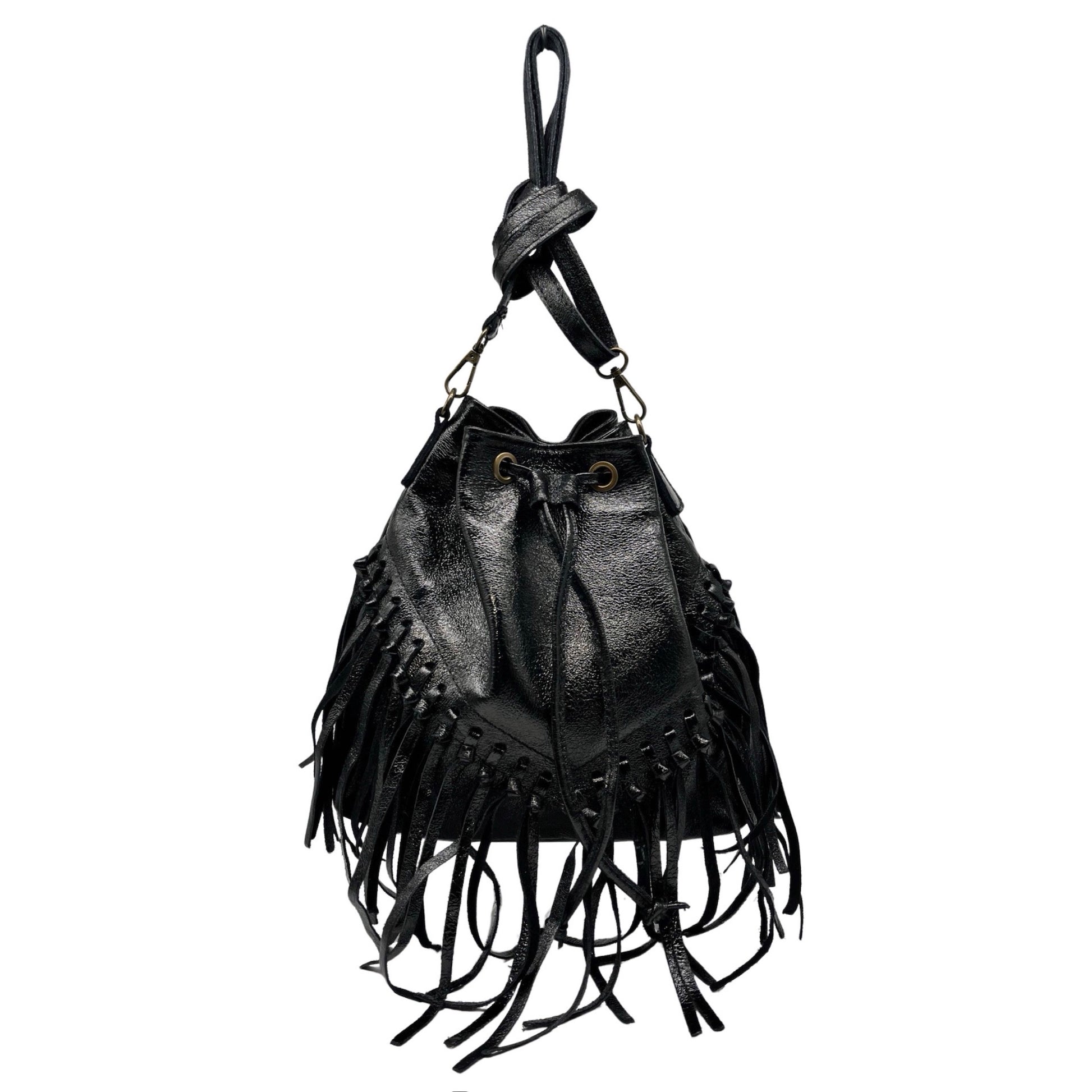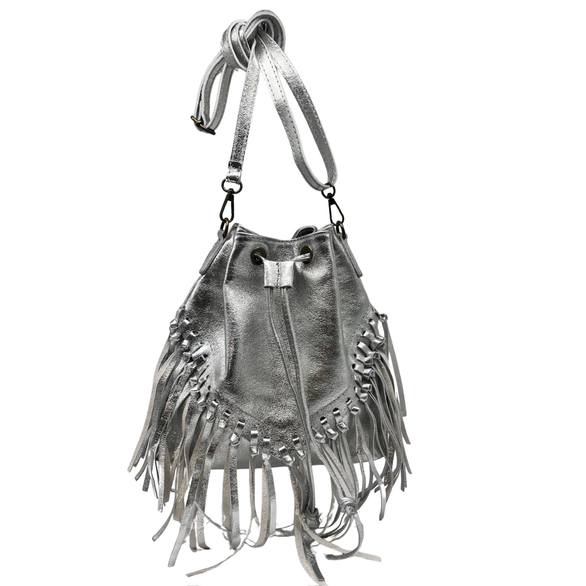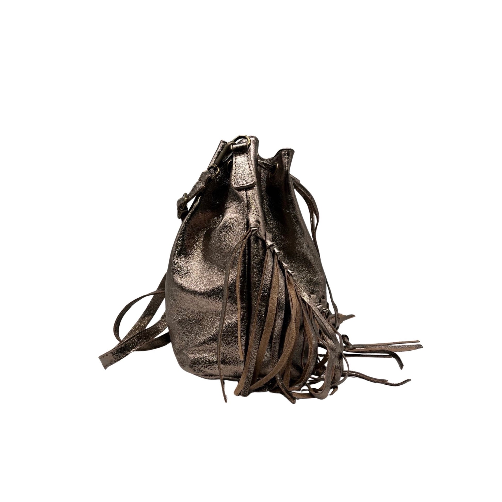 | Le sac seau Aurélia en cuir irisé, fabriqué en Italie, présente un style bohème avec des franges sur le devant. Cet accessoire combine élégance artisanale et décontraction, idéal pour compléter un look bohème chic avec une touche de sophistication italienne. |