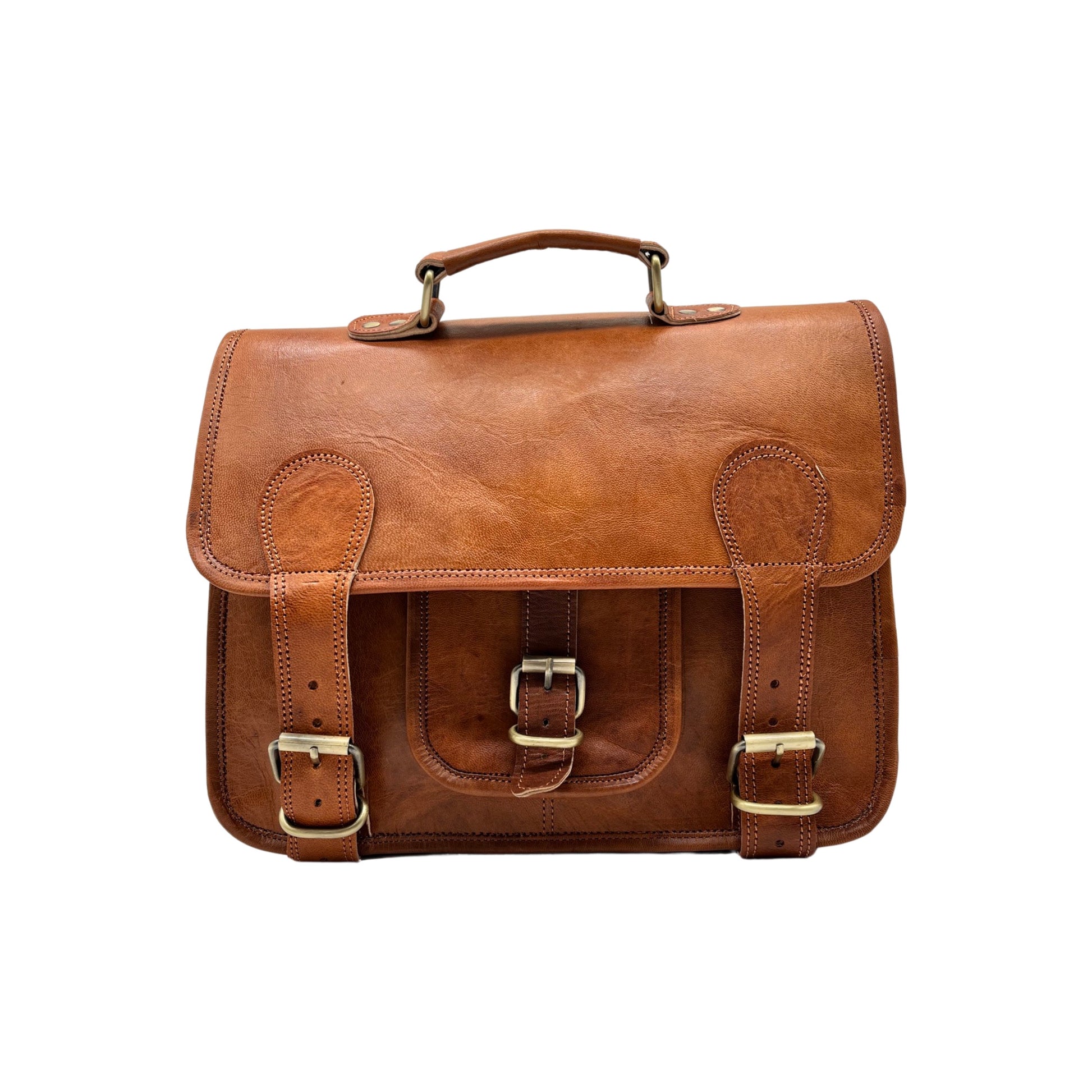 Le cartable Mahima en cuir de chèvre véritable est fabriqué de manière artisanale avec un style vintage élégant. Avec sa taille de 33cm, il est idéal pour une utilisation professionnelle ou personnel qui ont besoin d'un sac solide et fonctionnel.