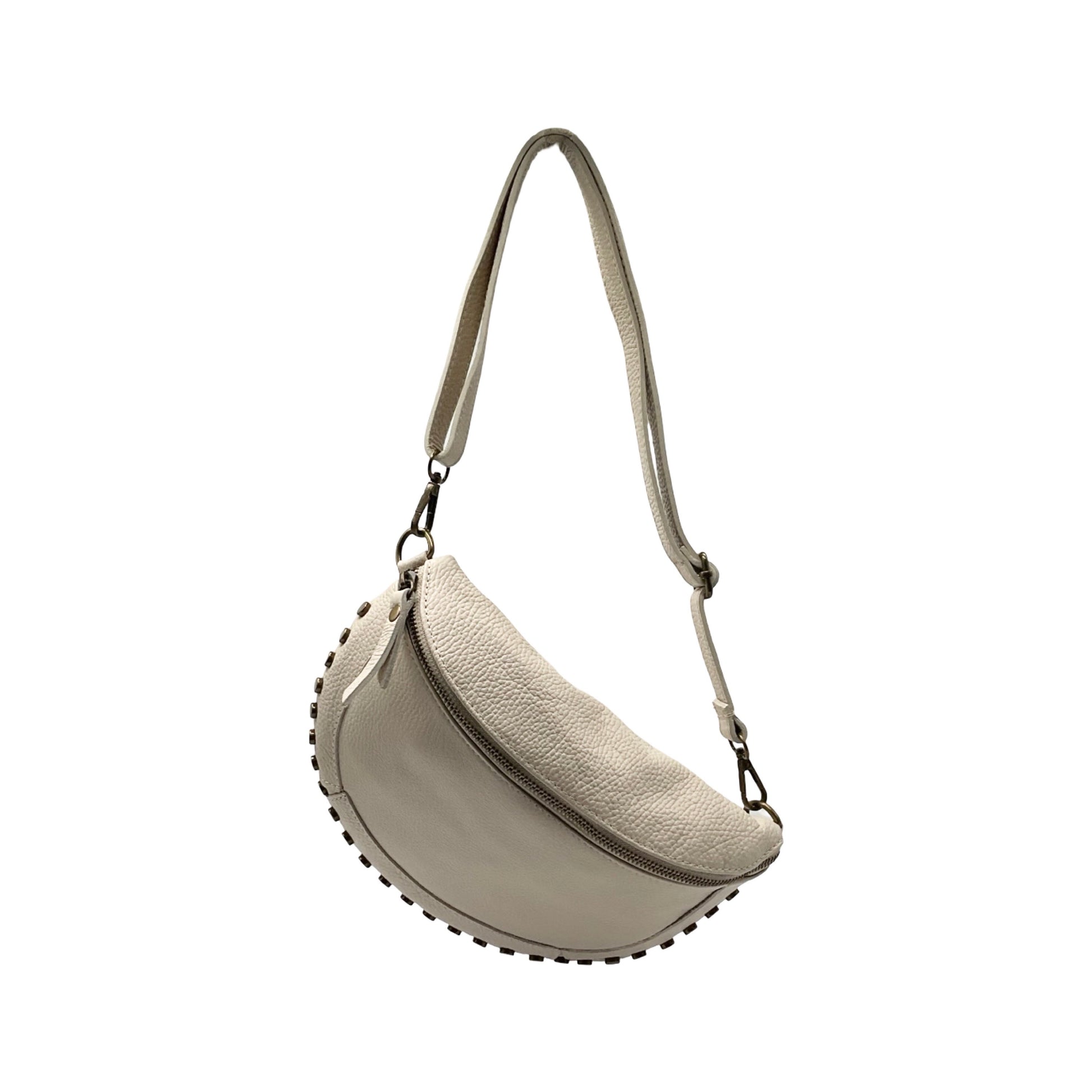 Sac banane en cuir grainé, fabriqué en Italie, orné de clous décoratifs pour une allure moderne et audacieuse. Doté d'une fermeture zippée et d'une bandoulière ajustable, il allie style et praticité pour accompagner vos looks au quotidien.