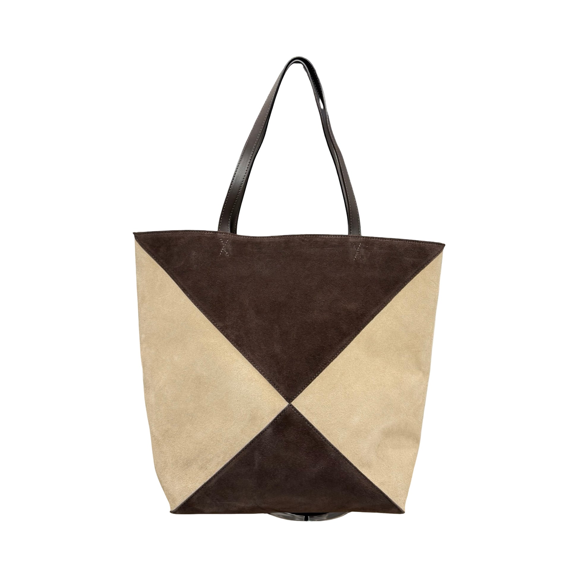 Sac Xara, une création qui fusionne le minimalisme et l'audace géométrique. Ce cabas en cuir suède (daim) bicolore est la pièce idéale pour celles qui recherchent un luxe qui se voit par sa qualité et l'originalité de sa coupe.