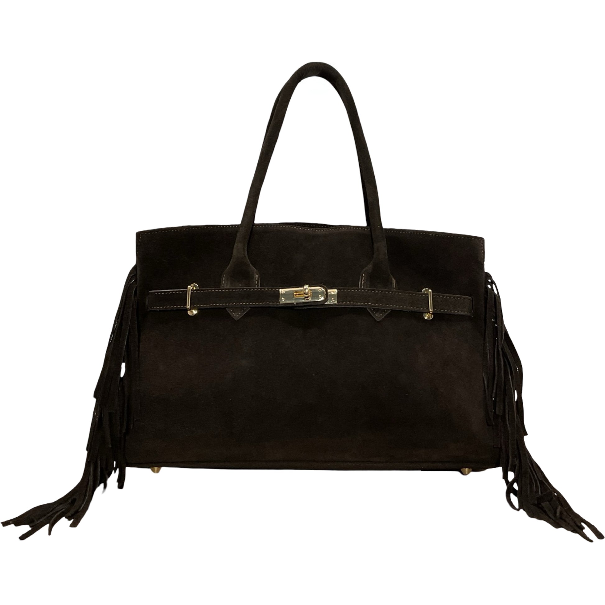 Adoptez un look bohème chic et intemporel avec ce magnifique sac fourre-tout structuré. Confectionné dans un cuir suède, son design évoque les sacs emblématiques de luxe. Il est rehaussé de longues franges latérales qui ajoutent du mouvement à votre démarche.